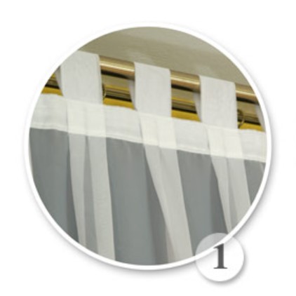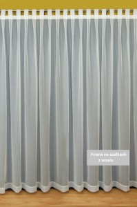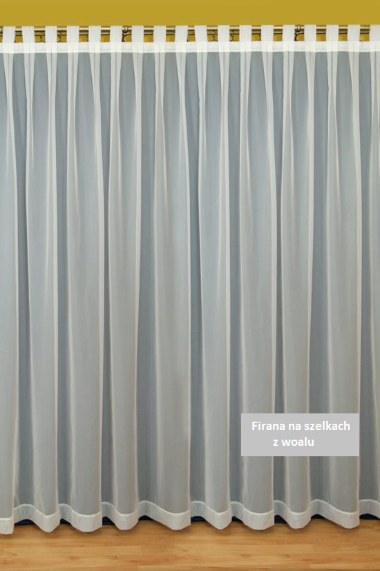 Firana pokojowa uszyta z lekkiego, przezroczystego woalu w białym lub kremowym kolorze. Uszyta na szelkach, które są wszyte na stałe w kontrafałdę. Wykończona zakładką z obszyciem 10 cm.