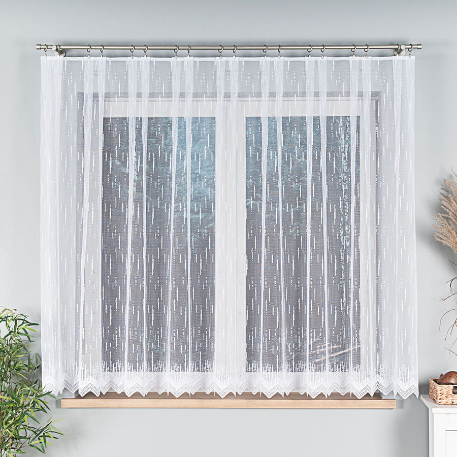Prezentowany model firany zachwyca każdym, najmniejszym nawet detalem i szczegółem. Śnieżnobiała, bardzo efektywna, na całej powierzchni posiada delikatne drapania w formie pionowych kresek. Na dole znajduje się wzór z wykończeniem w postaci zygzaków. Największą zaletą tego modelu jest możliwość zamówienia firany do salonu na metry zarówno jeśli chodzi o jej szerokość, jak również długość. Możesz zdecydować się na długie firany lub wybrać model sięgający do parapetu lub do połowy okna. Twój wybór - Twoje i nasze zadowolenie.