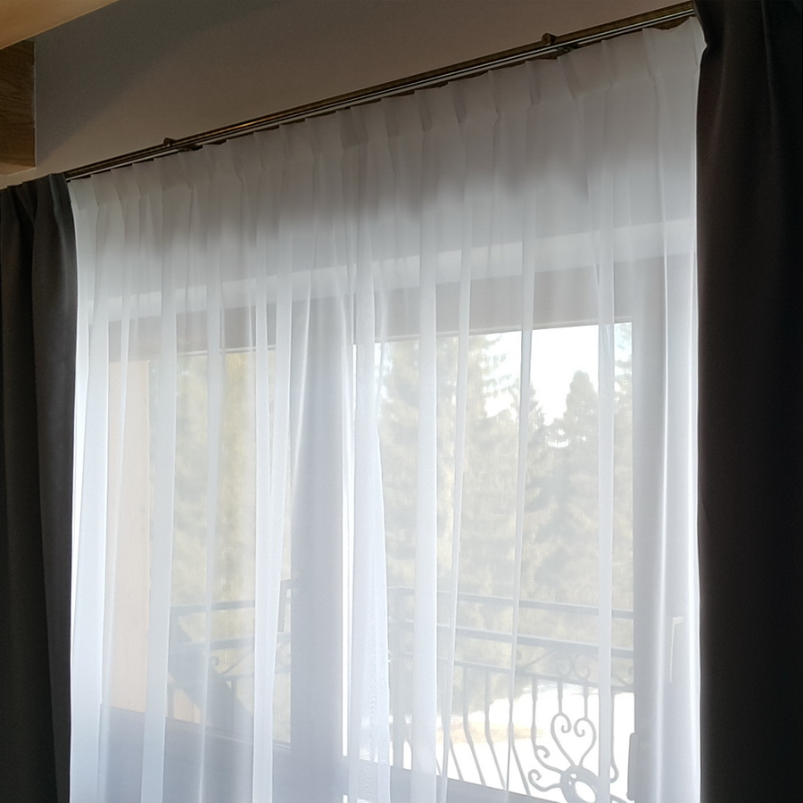 Do uszycia tych firan użyto wysokiej jakości woalu, który marszczy się w proporcji 1:2. Odpowiednia struktura zapewnia doskonałą przejrzystość od strony pokoju i jednocześnie zasłania oraz utrudnia widok od strony zewnętrznej. W produkt wszyto na stałe plastikowe fleksy, które pozwolą w szybki sposób go zawiesić na szynę lub żabkę. Utworzone zakładki są trwałe i nie mają one skłonności do rozszerzania się w trakcie normalnej eksploatacji, prania oraz prasowania. Firana jest sprzedawana w 3 rozmiarach, a każdy zestaw zawiera 10 sztuk produktu.