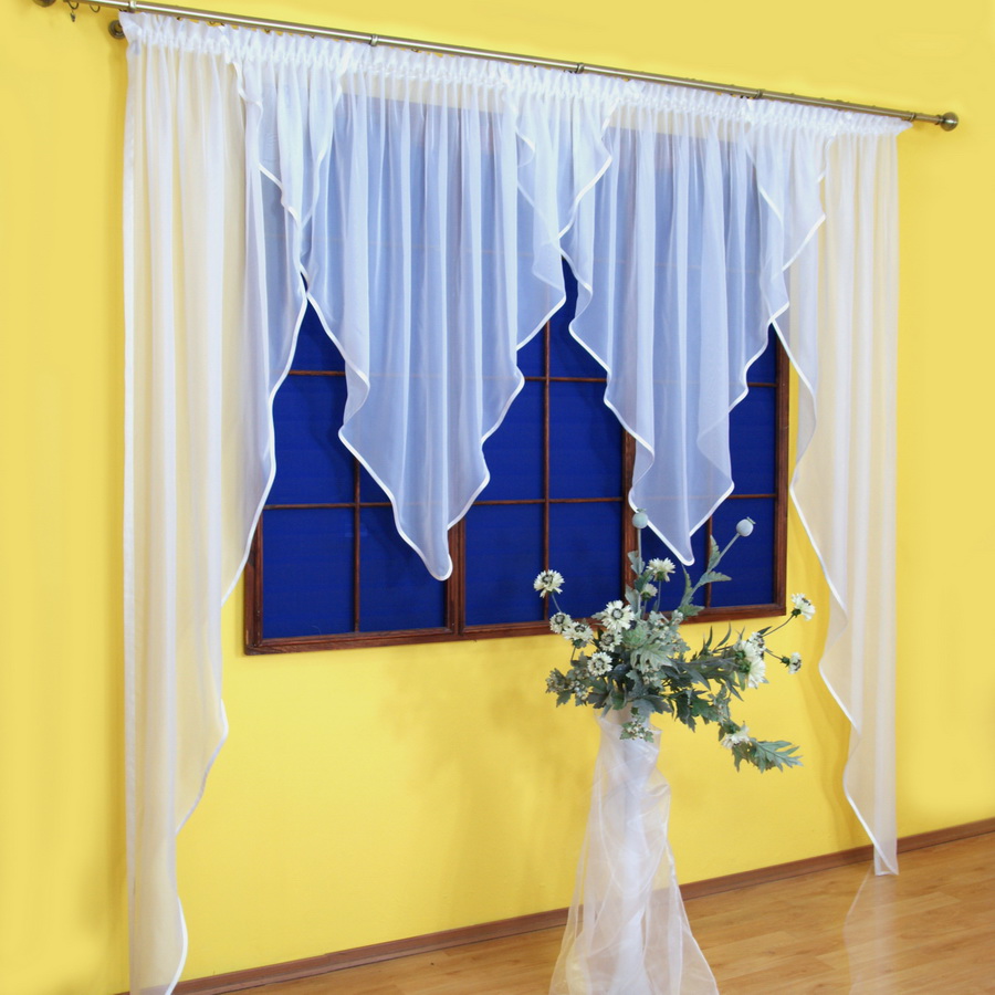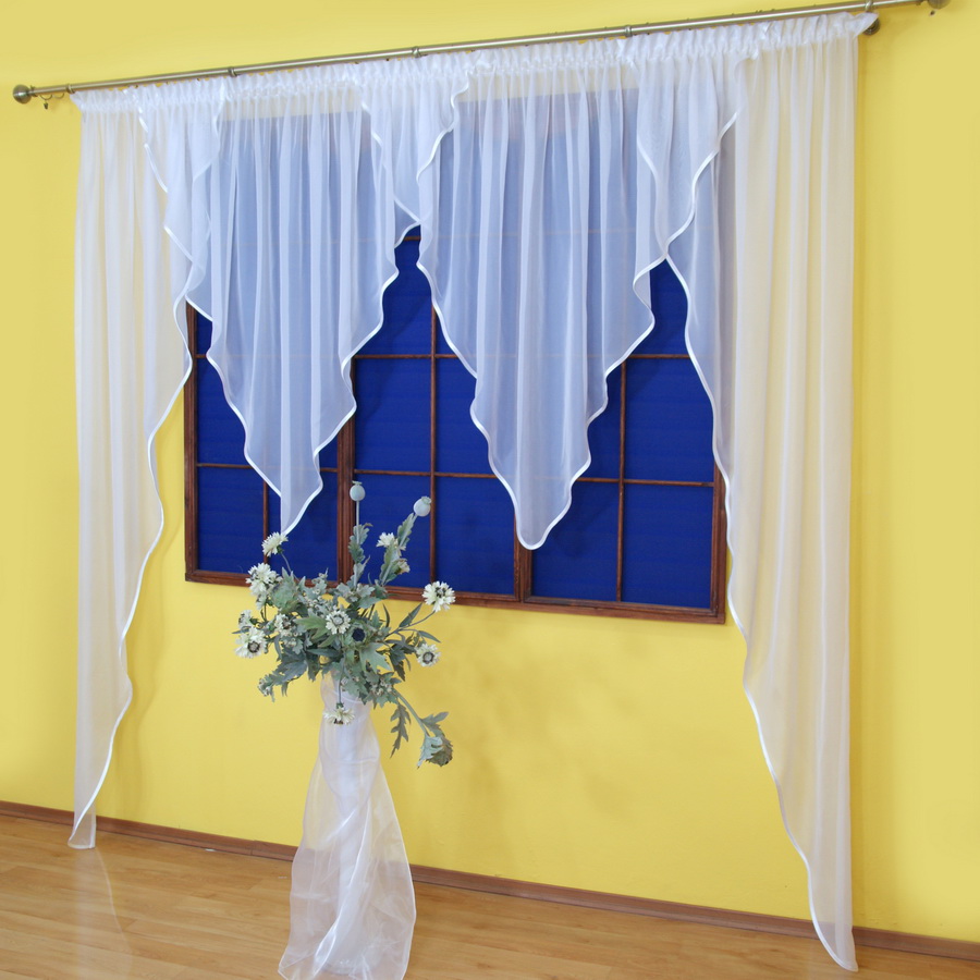 Piękne firany dodają każdemu wnętrzu przytulności i sprawiają, że zamieniają się one z surowego pomieszczenia w słodki, klimatyczny kącik. Jest to najpopularniejszy dodatek dla każdego pokoju. Firma Magdalena przedstawia śliczną dekoracyjną firanę, która została uszyta z białego woalu oraz obszyta atłasową lamówką dostępnej w różnej gamie kolorystycznej. Całość składa się z dwóch trójkątów środkowych o wysokości 145 cm oraz dwóch bocznych na wysokość 250 cm. Zestaw został razem uszyty na taśmie 1:2, a góra wykończona jest wypustem.