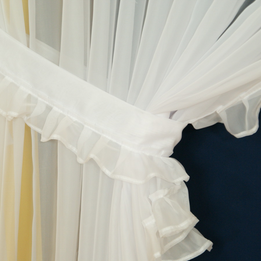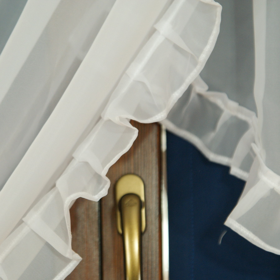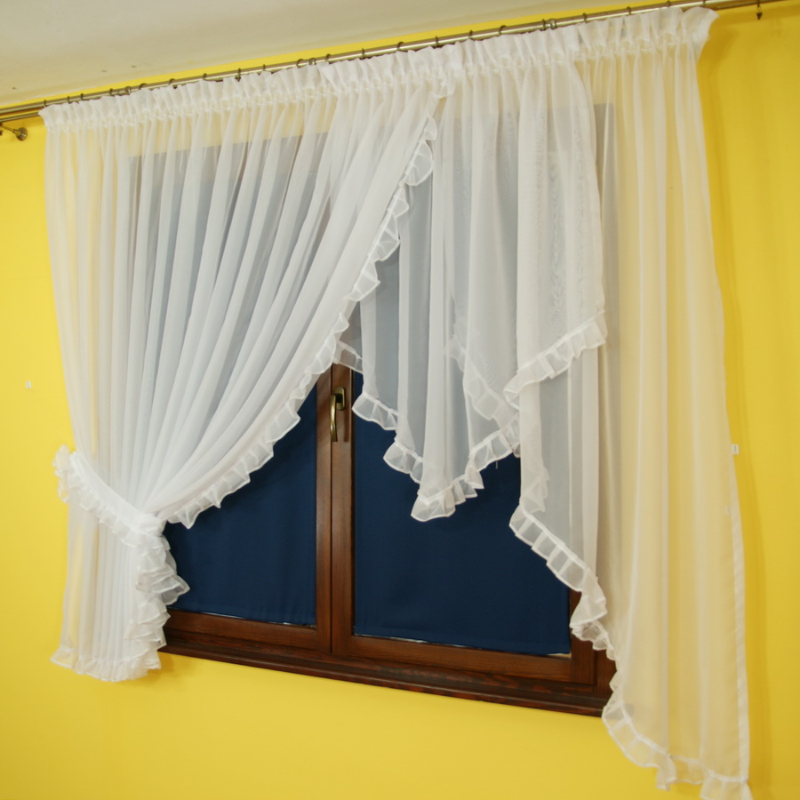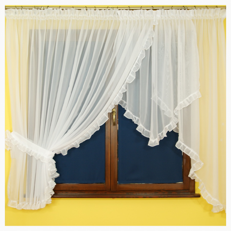 Elegancka firana uszyta z woalu wykończona gustowną falbaną. Jedna strona firany podciągnięta do boku, druga natomiast stopniowana dwoma ozdobnymi
