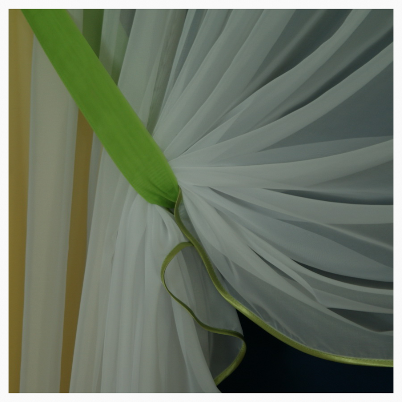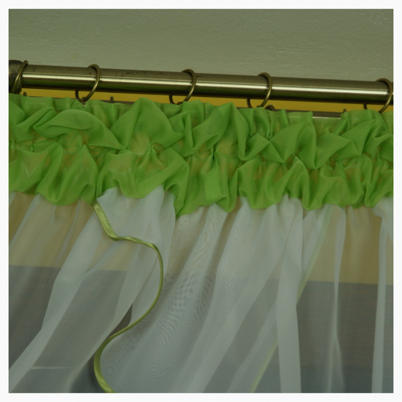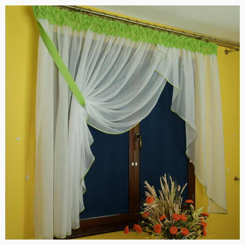 również wykonaną z woalu w kolorze podwiązki. Dół wykończony atłasową lamówką w kolorze bufki i podwiązki. Delikatna firana, świetnie