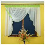 Dekoracyjna firana wykonana z białego woalu, podpięta do boku ozdobną podwiązką uszytą z woalu jednobarwnego. Góra firany