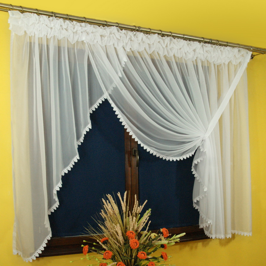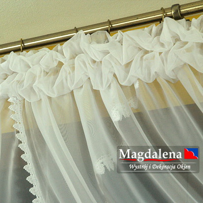 Dół wykończony dekoracyjną gipiurą 3 cm szerokości. Delikatna firana, świetnie nadaje się do każdego pomieszczenia. Przeznaczona jest na