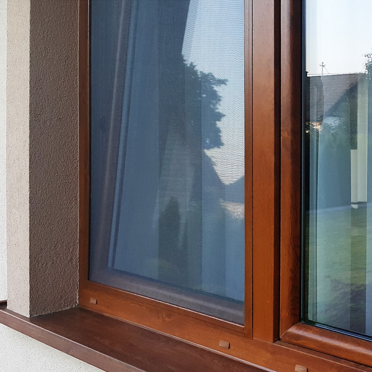 Niezwykle praktyczna i estetyczna moskitiera okienna w kolorze złoty dąb (okleina).