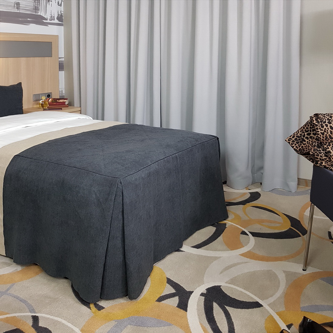 Narzutka uszyta z tkaniny obiciowej Enjoy, z plisą szerokości 15 cm. Długość falbany to 55 cm.