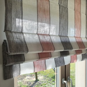 Praktyczna i dekoracyjna roleta rzymska wykonana z tkaniny poliestrowej o splocie płóciennym przypominającym tkaniny lniane.