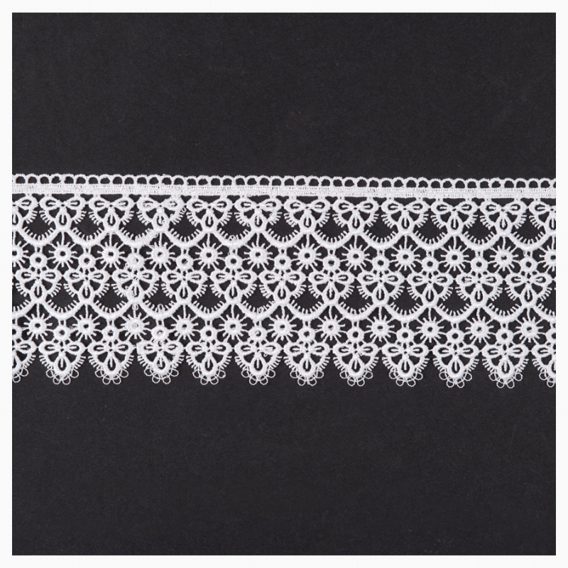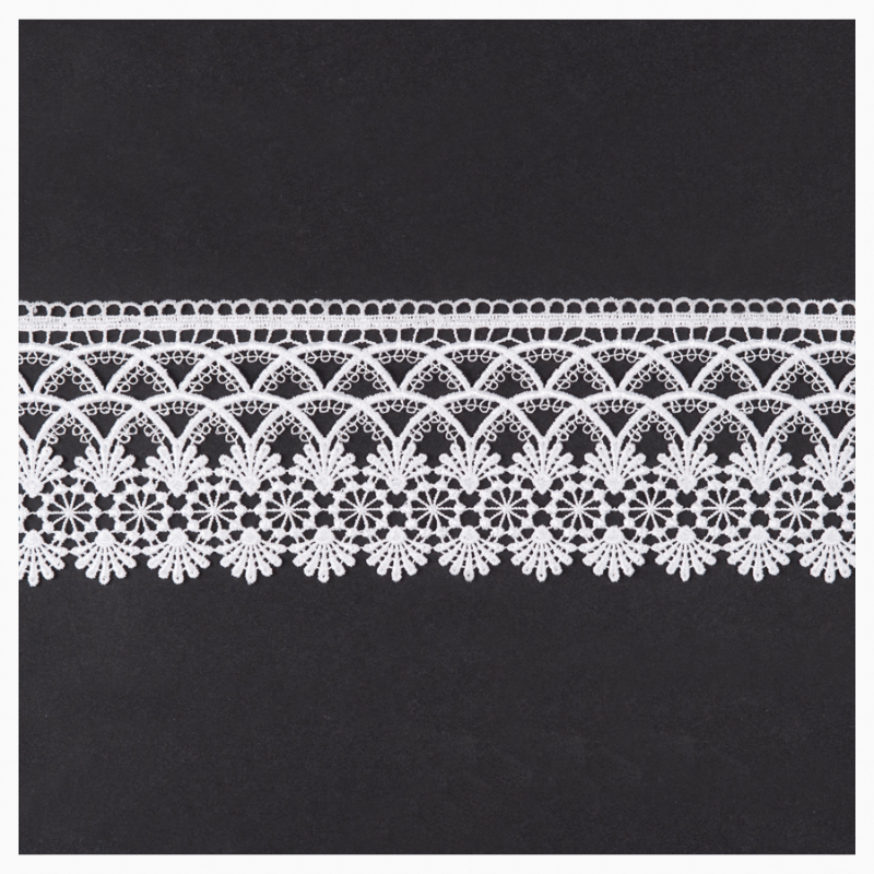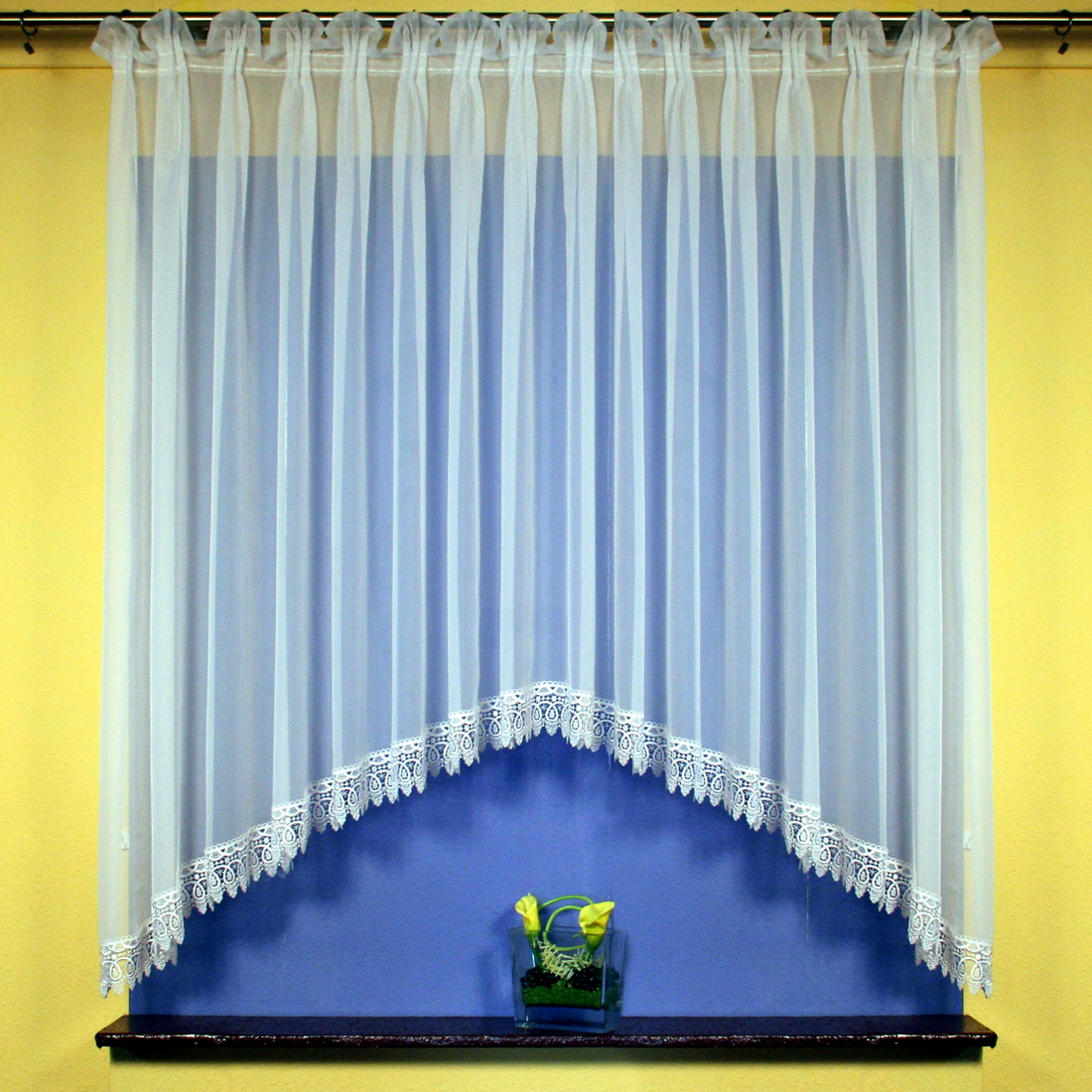 Efektowna firanka w całości uszyta z białego woalu i wykończona dekoracyjną gipiurą. Całość uszyta na taśmie marszczącej. Firanka idealna zarówno do nowoczesnego, jak i klasycznego wnętrza.
