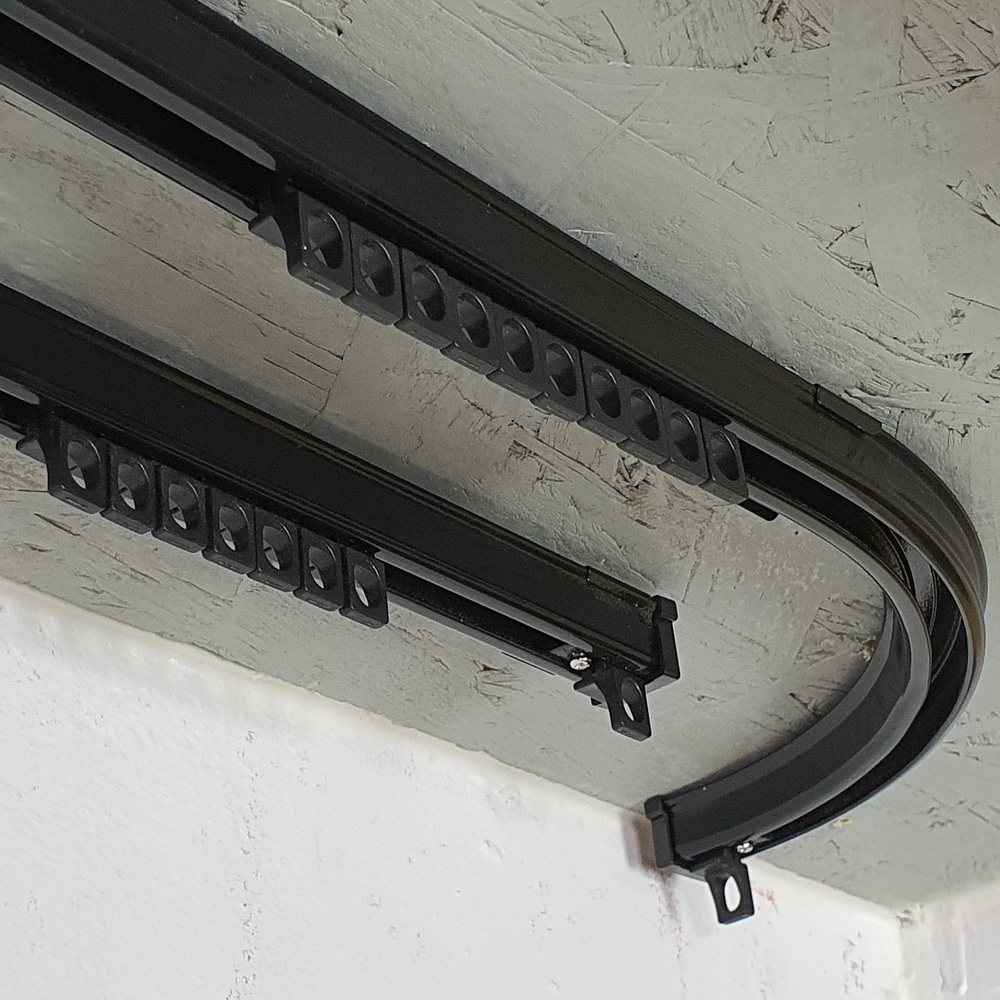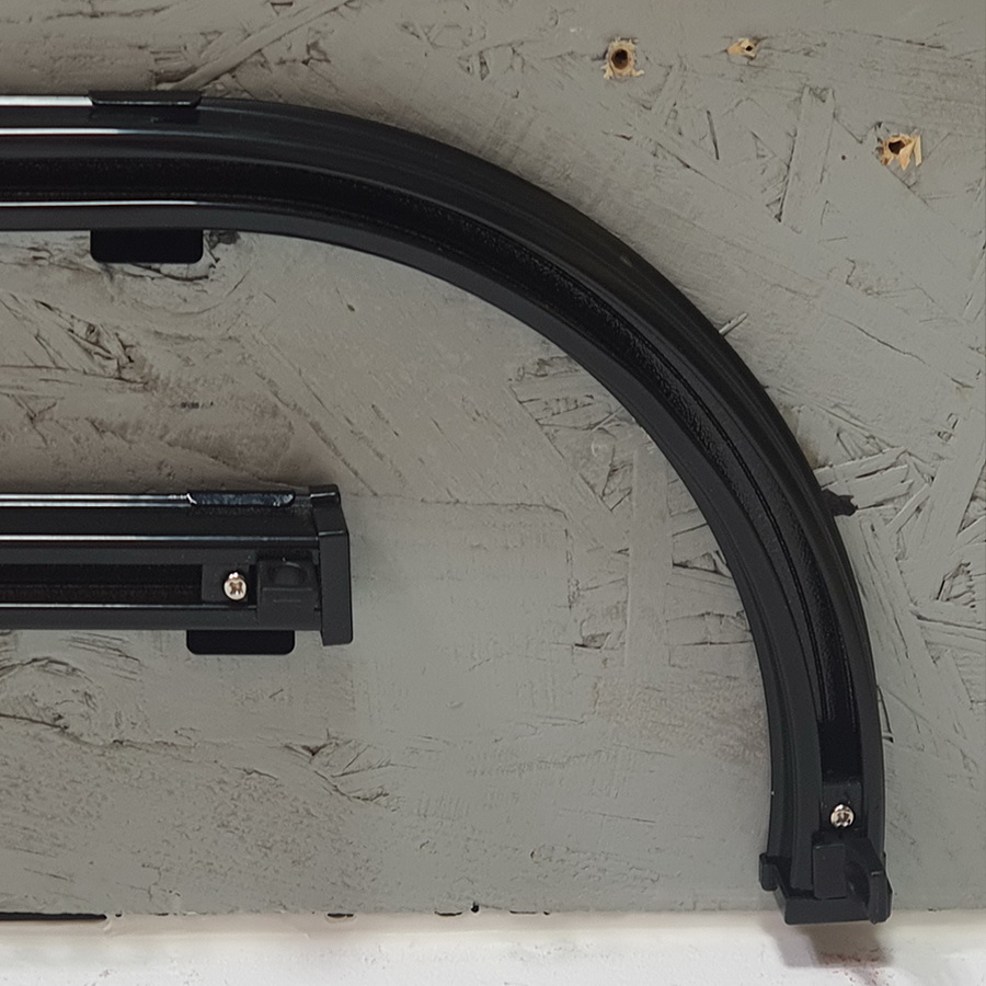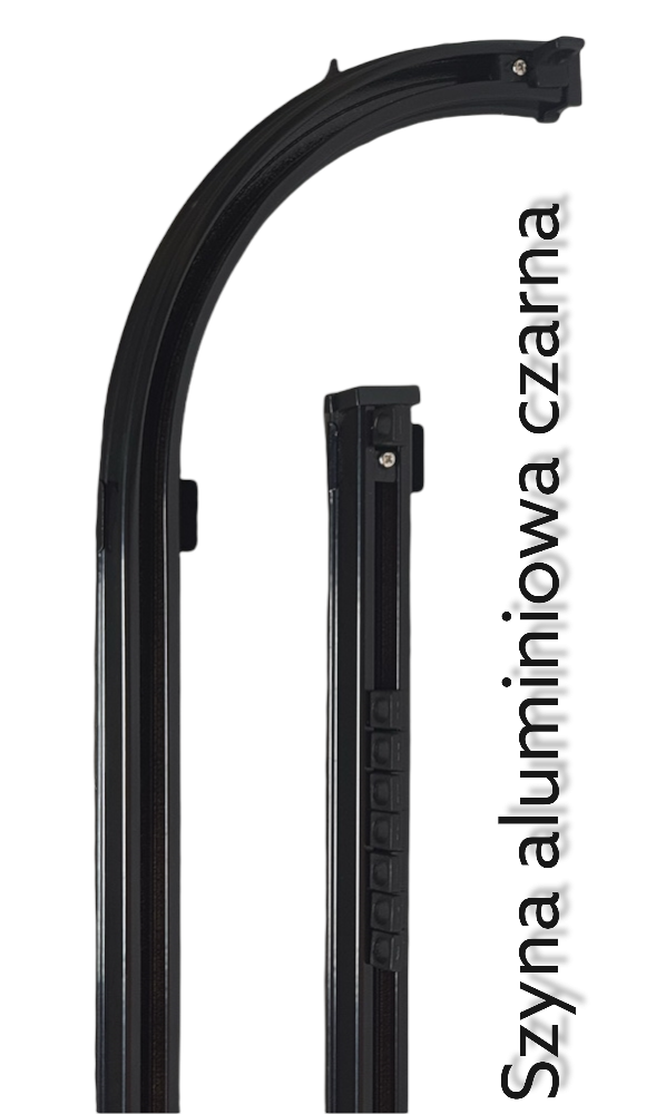 Szyna sufitowa aluminiowa gięta pod kątem 90 stopni w kolorze czarnym.