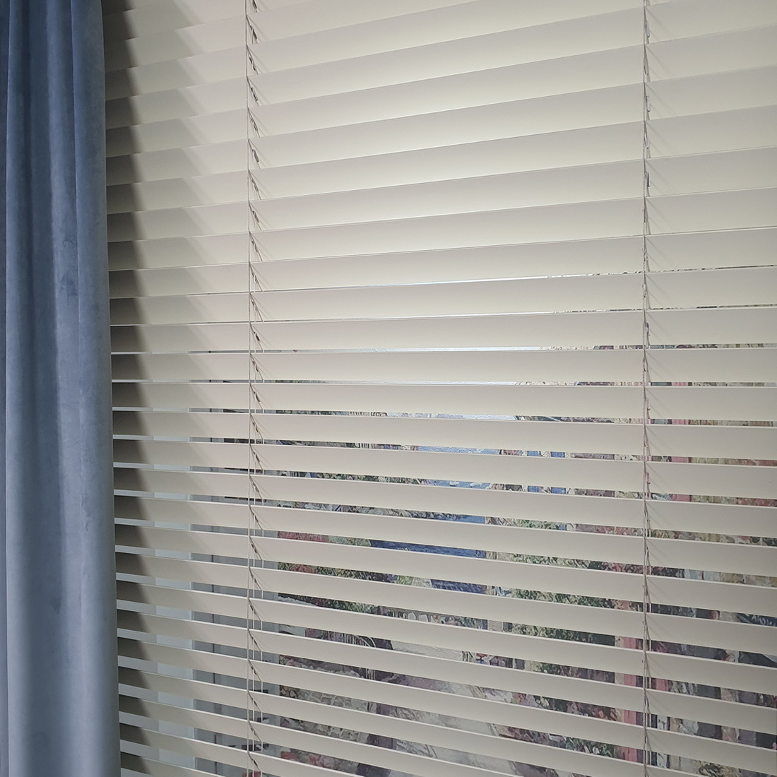 Żaluzja drewniana do salonu w kolorze kremowym na wymiar 190x170 cm.