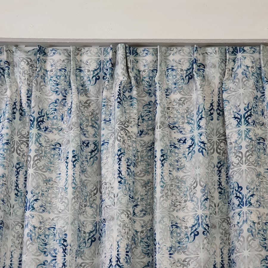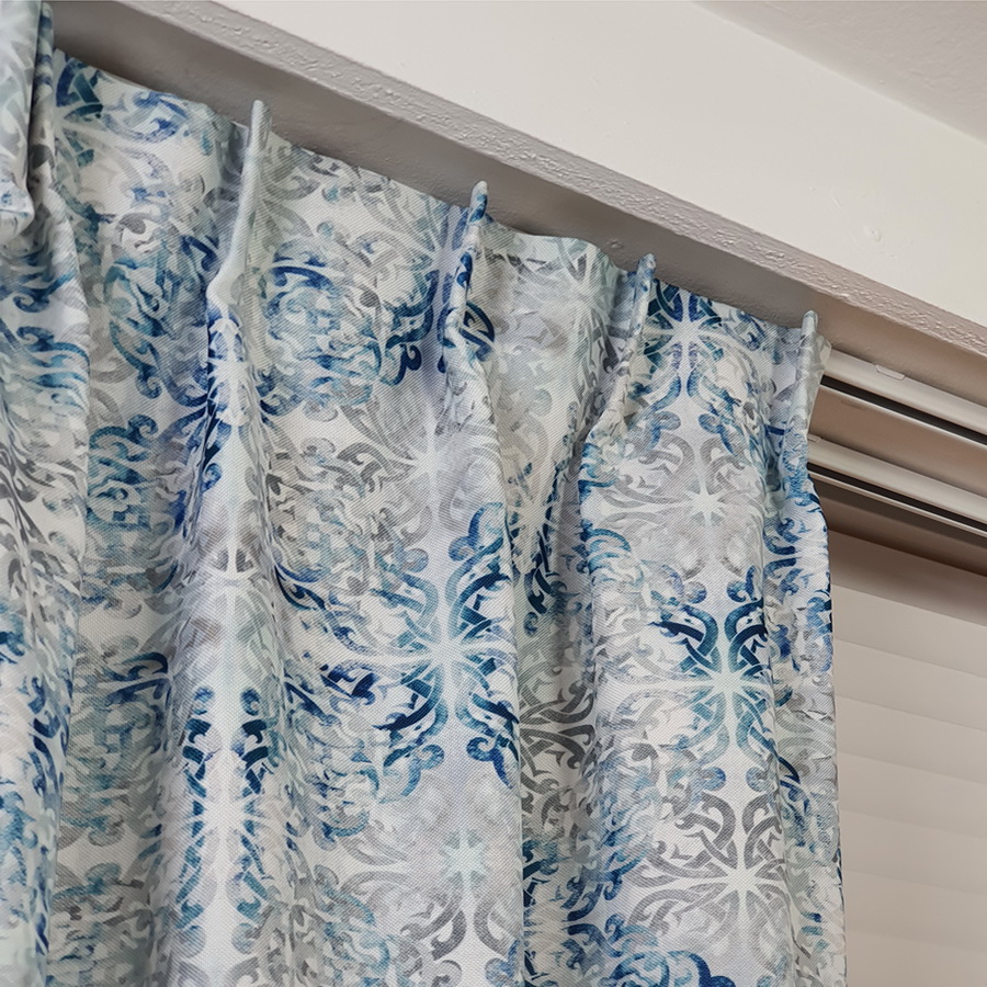 Zasłona w stylu prowansalskim, skandynawskim z drukowanej tkaniny o strukturze delikatnego płóciennego splotu. Mozaikowy wzór na tkaninie idealnie wpasuje się do wnętrz w obu stylach.