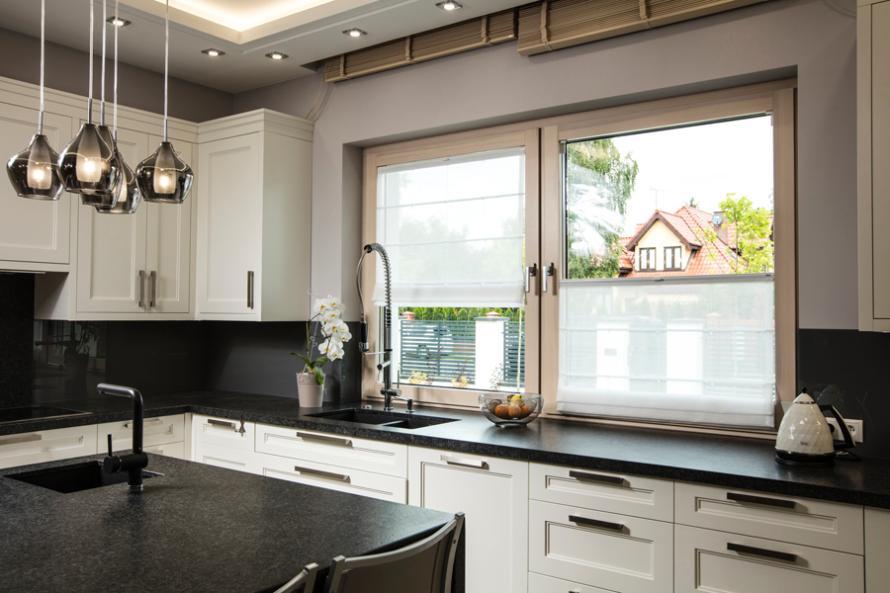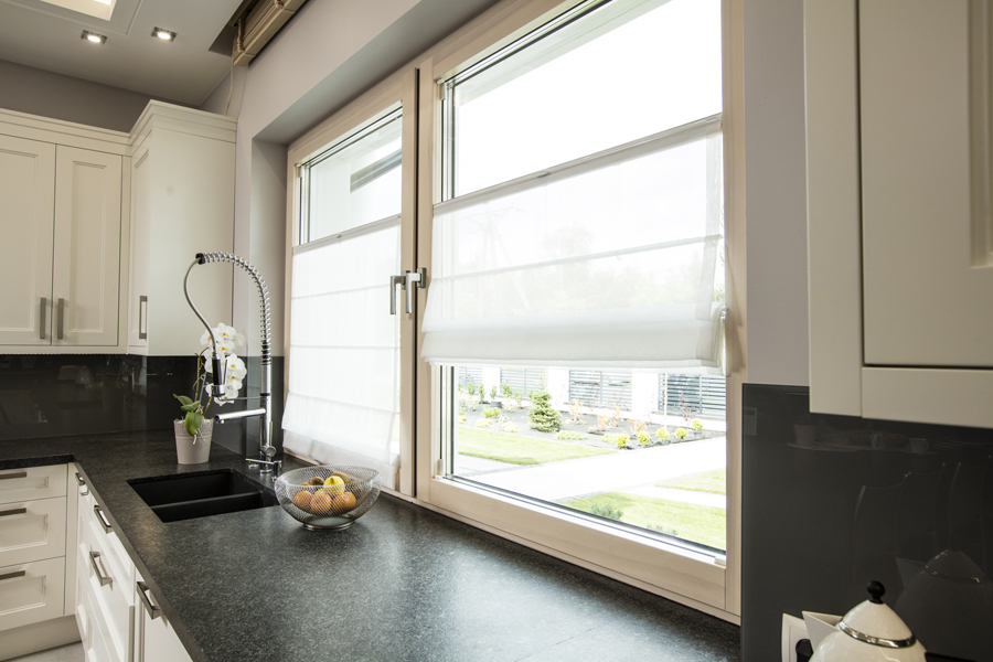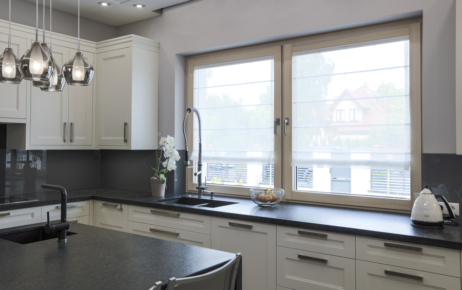 Stylowa kuchnia z nowoczesną roletą rzymską