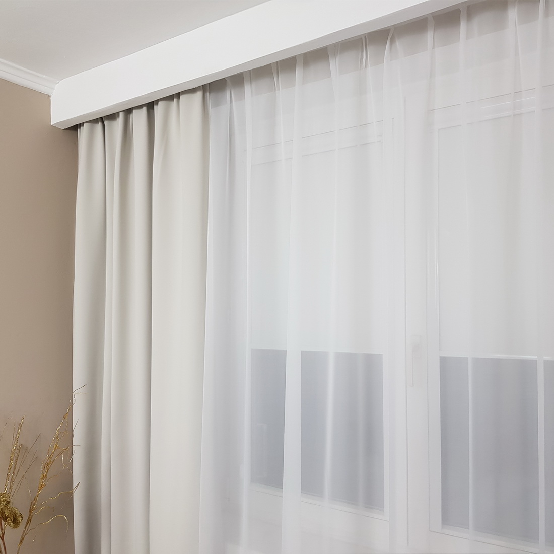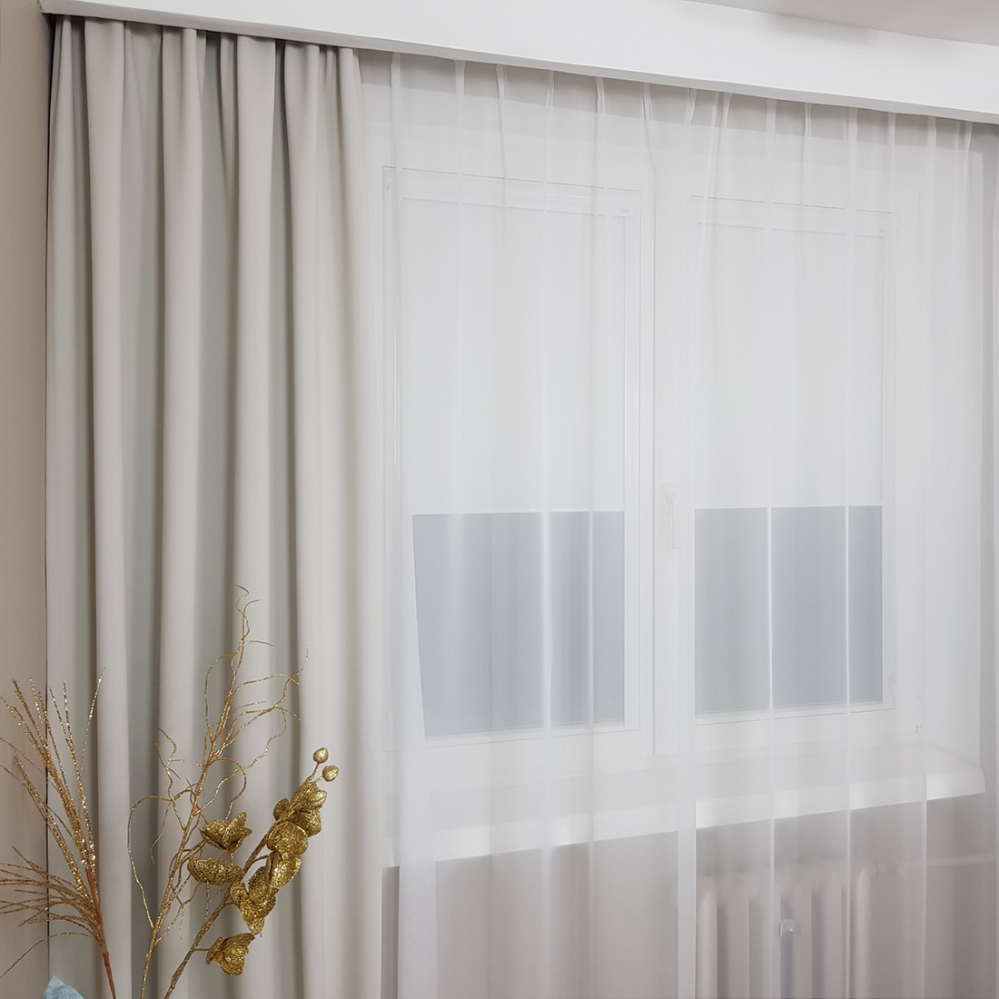 Zasłona z blackout UNI 102/150, flex 1:1,5. Obszycie dołu 1x8, wymiar po zmarszczeniu.