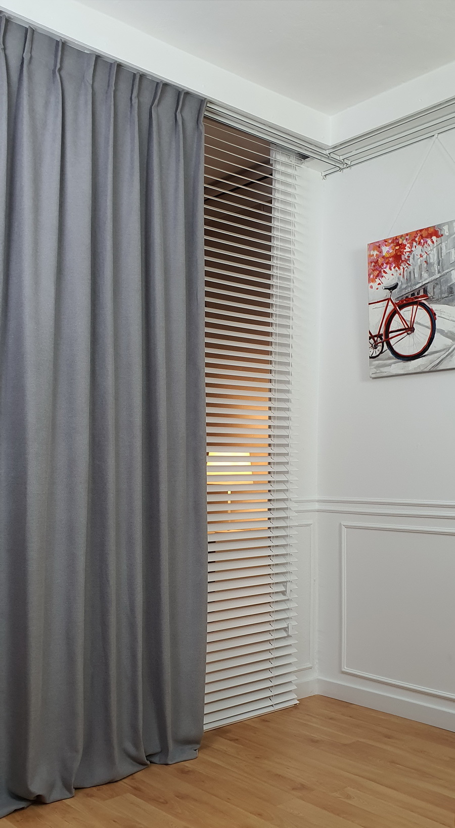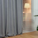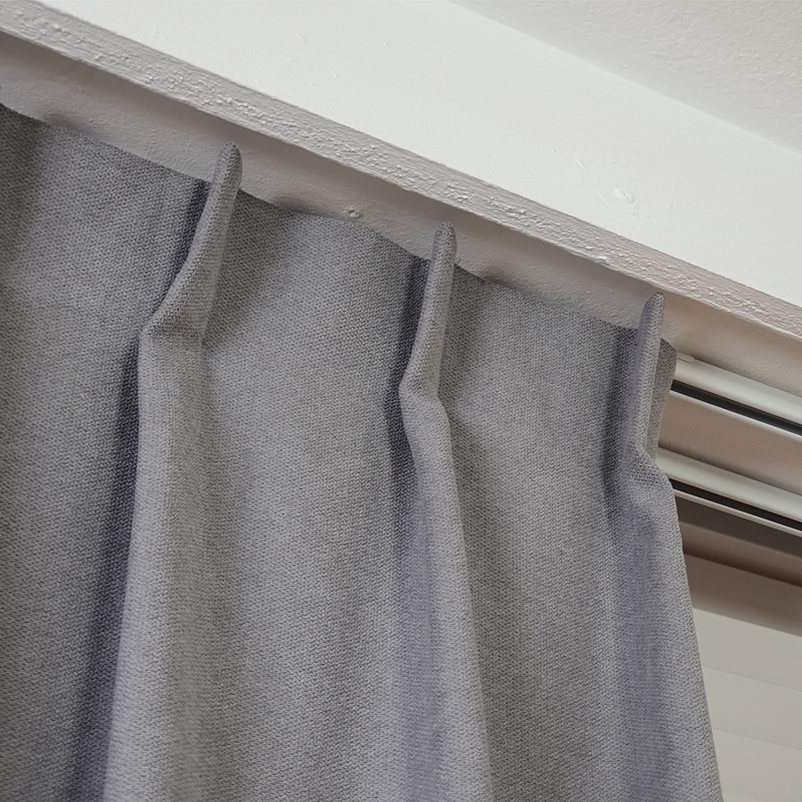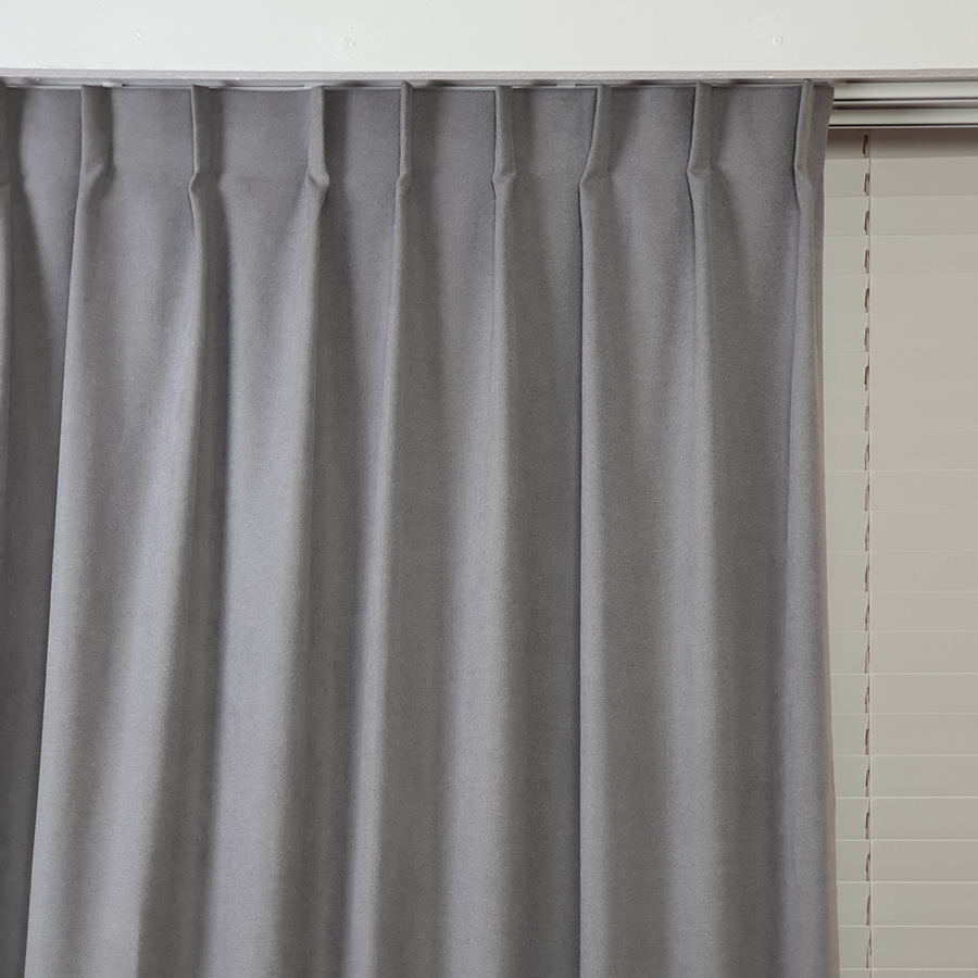 Zasłona na zamówienie w kolorze szarym z tkaniny zaciemniającej 60%.