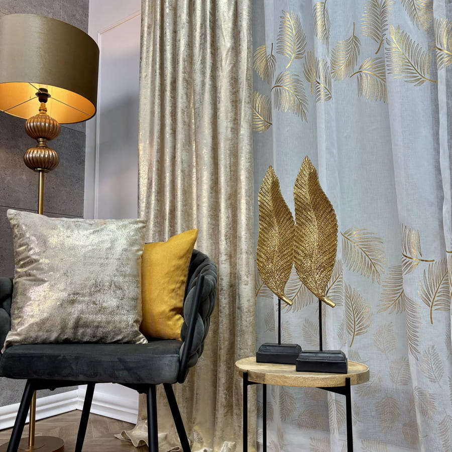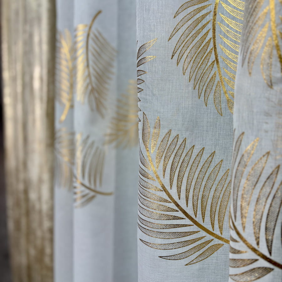 Firanka uszyta z lekkiej i półprzezroczystej etaminy, wykończona dołem ołowianym obciążnikiem charakteryzuje się trwałością i łatwością w pielęgnacji. Jej neutralny, biały kolor pasuje do różnych aranżacji wnętrz, dodając im lekkości, a motyw złotych liści to doskonały sposób na wprowadzenie do wnętrza naturalnego akcentu. Zastosowana w firanie taśma z marszczeniem 1:2, pozwala na zawieszenie firanki za pomocą żabek lub agrafek oraz bezpośrednio na drążku karnisza.