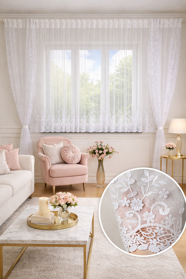 Szukasz dekoracji, która przyciąga wzrok i nadaje wnętrzu wyjątkowego charakteru? Ta gotowa firanka na taśmie to idealne połączenie subtelnej etaminy z bogatym zdobnictwem. Kwiatowy haft nadaje jej lekkości, a dół wykończony efektowną gipiurą stanowi solidne i eleganckie zwieńczenie całości. Materiał pięknie przepuszcza światło, dbając jednocześnie o prywatność w Twoim domu. Dzięki uniwersalnej taśmie marszczącej, firana układa się w równe, estetyczne fale zaraz po zawieszeniu. To idealny wybór do salonu lub sypialni, gdzie liczy się przytulna atmosfera i klasyczna elegancja.