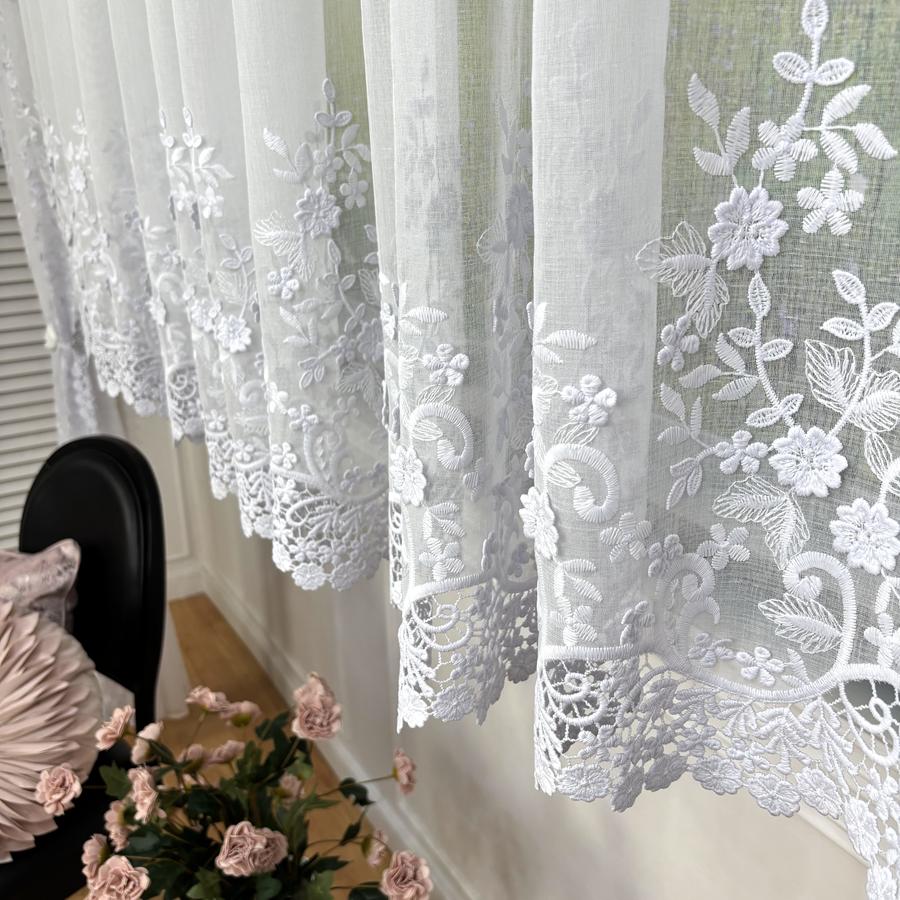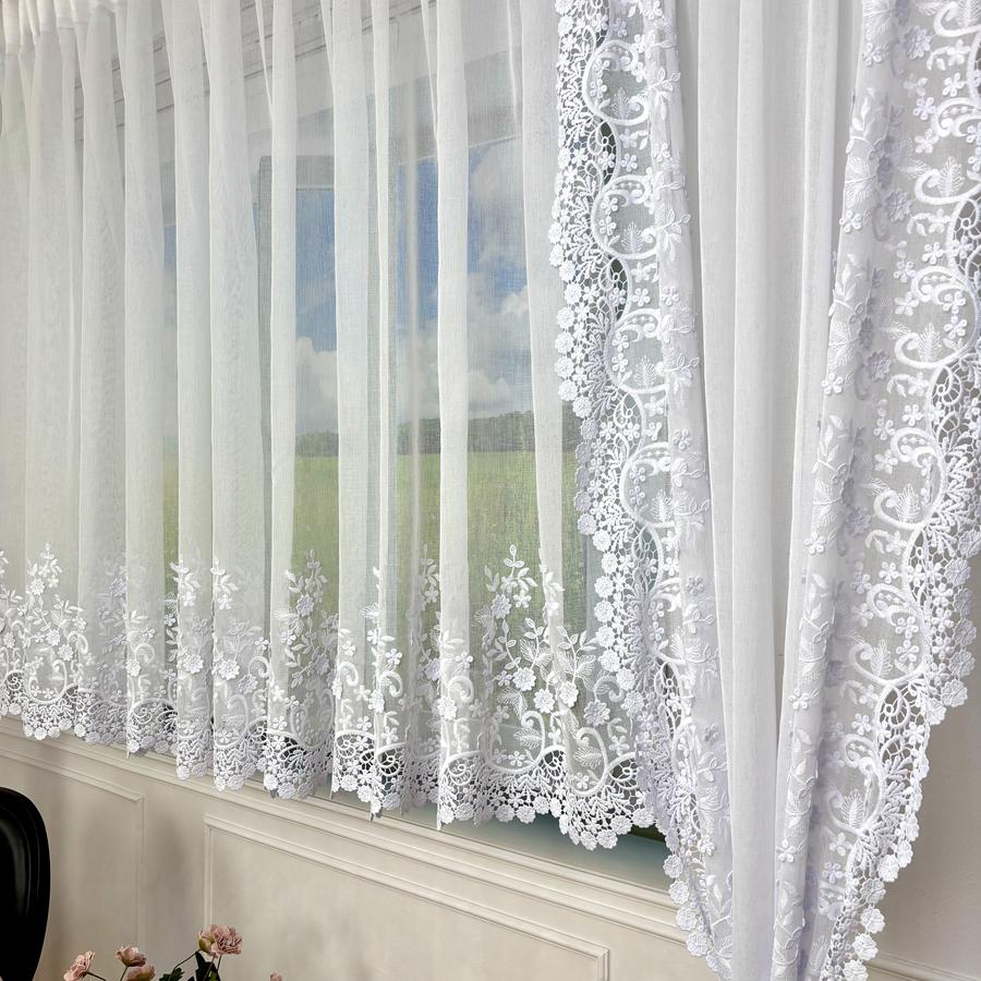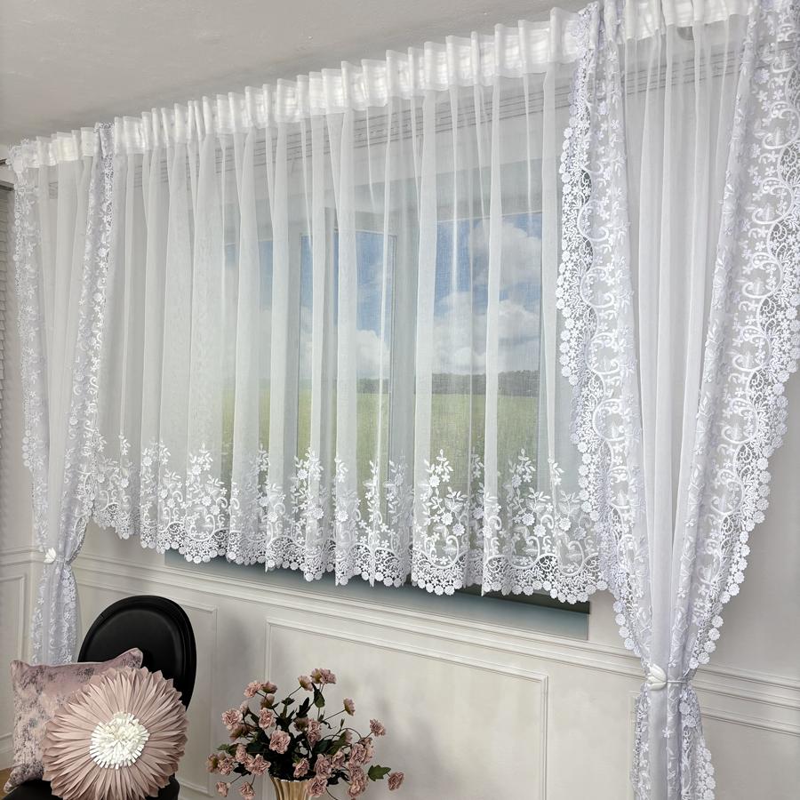Gotowa firanka na taśmie z gipiurową aplikacją do pokoju, rozmiar 400x145 cm.