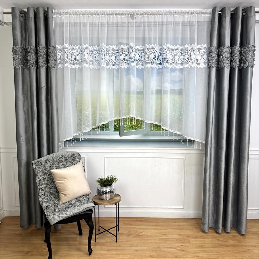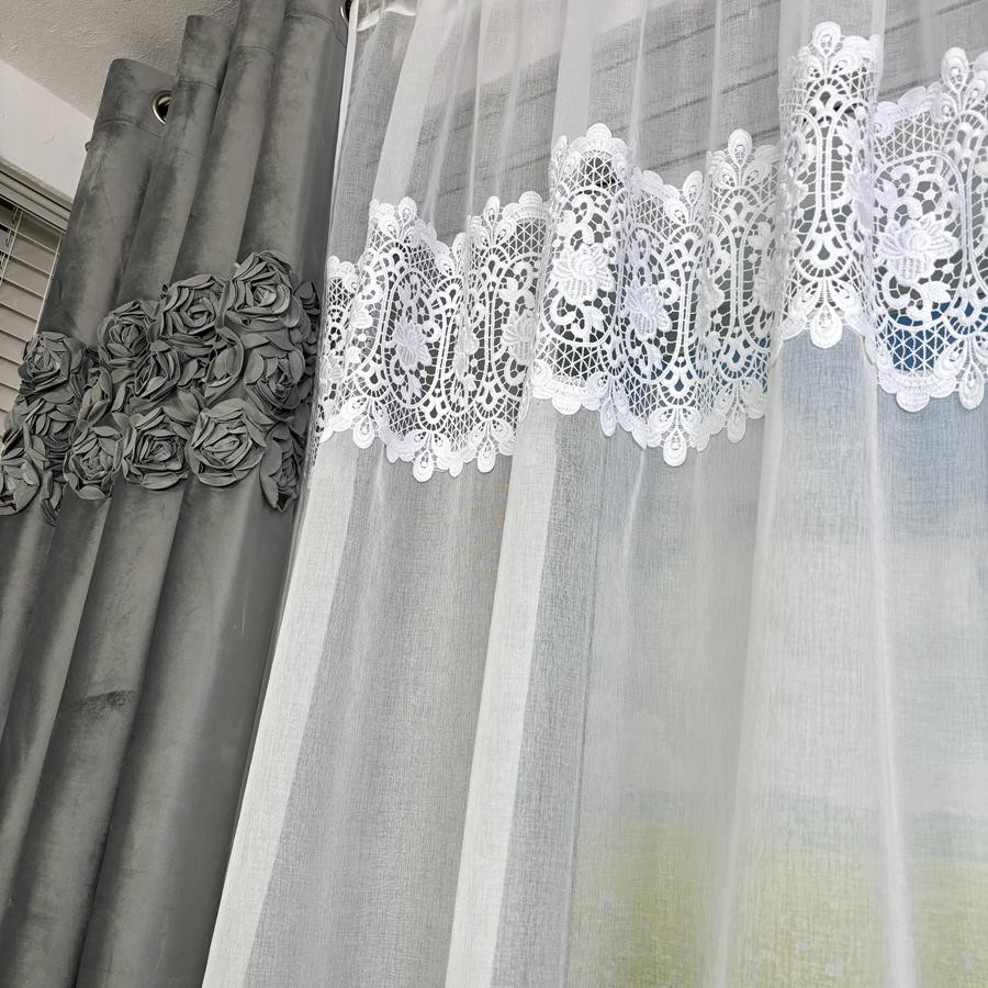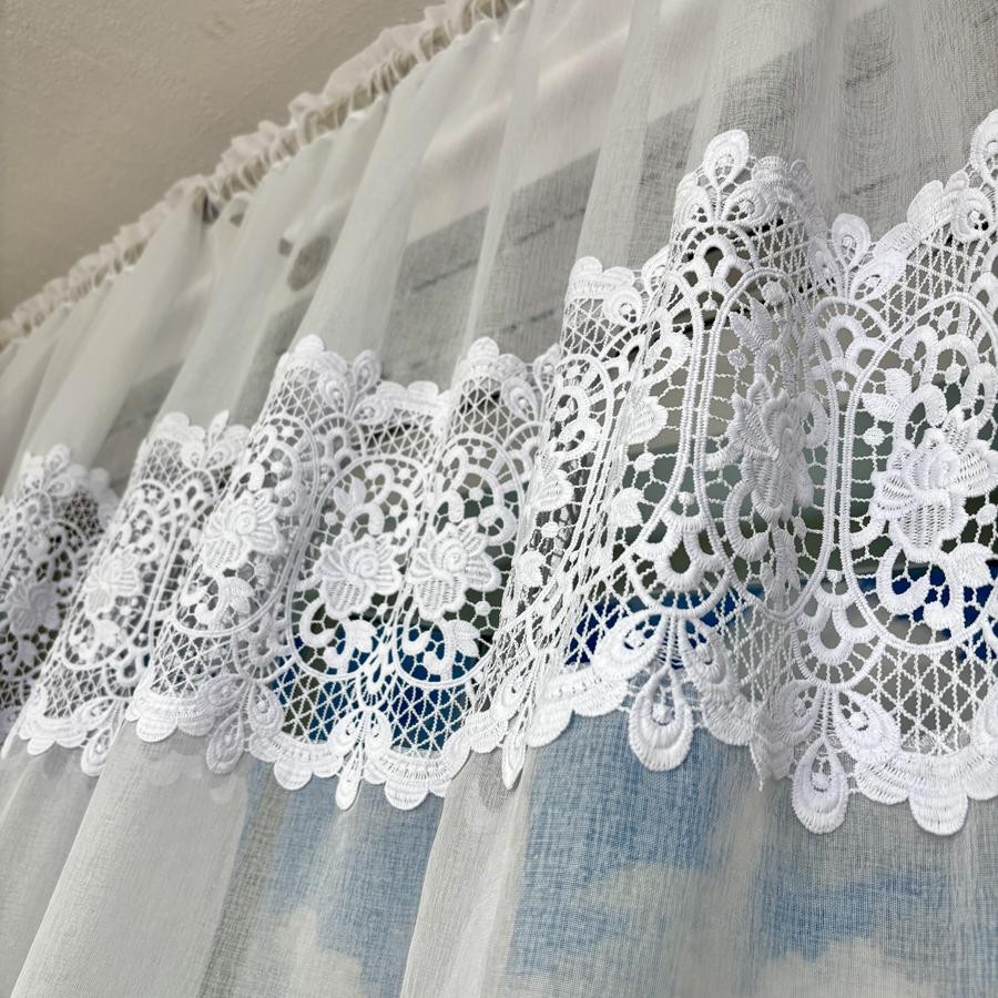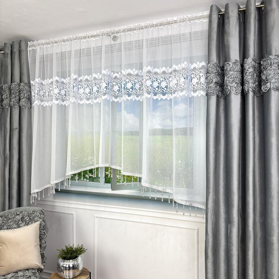Ta wyjątkowa firana wykonana z matowej etaminy zachwyca subtelną strukturą, która zapewnia prywatność, przepuszczając jednocześnie optymalną ilość światła. Największym atutem dekoracji jest bogata aplikacja z gipiury, która nadaje całości szlachetnego charakteru. Dolna krawędź wycięta w finezyjny łuk została dodatkowo ozdobiona zwisającymi koralikami, które pięknie pracują przy każdym ruchu powietrza, odbijając refleksy świetlne.