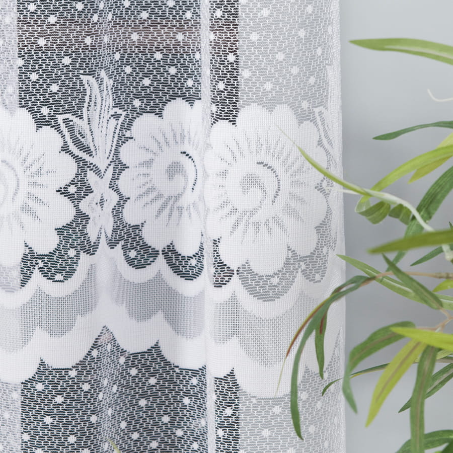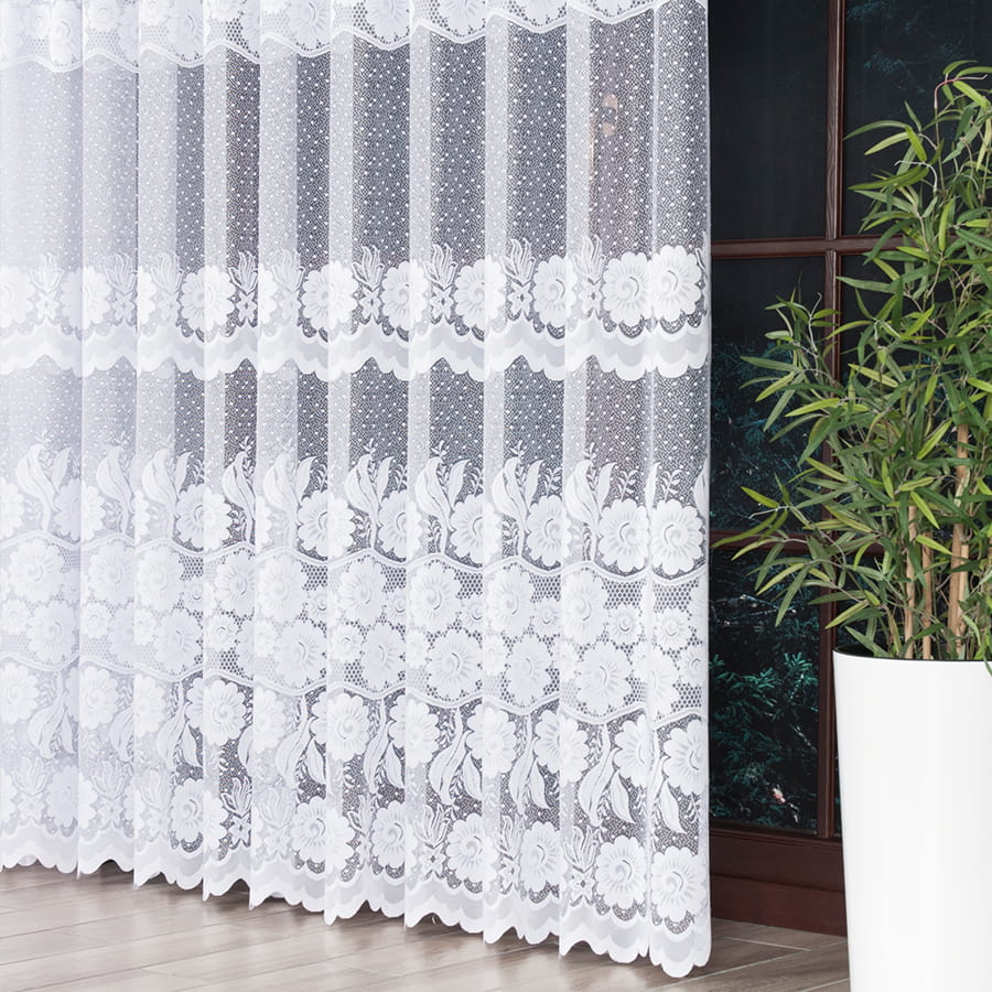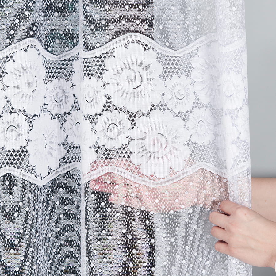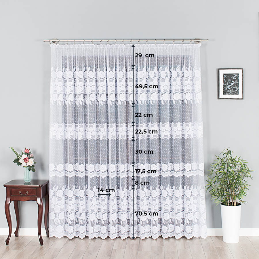 Firanka dostępna w metrażu, objęta tolerancją wysokości w granicach +/- 3 cm.