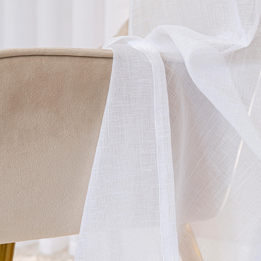 Firanka uszyta z lekkiej etaminy, charakteryzuje się trwałością i łatwością w pielęgnacji. Główną cechą wyróżniającą firankę jest imitacja naturalnych tkanin, takich jak len czy bawełna. Struktura przypomina drobne, nieregularne przeploty nici, co nadaje firance organiczny i nieco rustykalny charakter. Firanka nie zaciemnia pomieszczenia, a jedynie subtelnie rozprasza światło słoneczne, tworząc przyjemną atmosferę i chroniąc przed nadmiernym nasłonecznieniem.