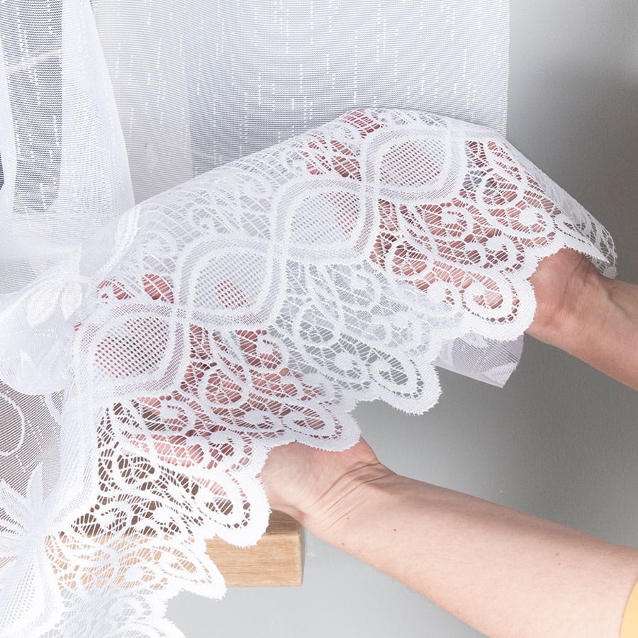 Firanka uszyta na taśmie marszczącej pięknie się układa, nie wymaga prasowania i można ją prać w pralce w niskiej temperaturze.