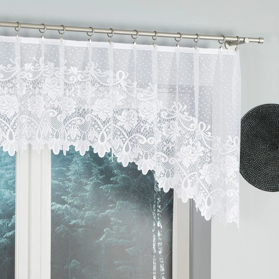 Model charakteryzuje się subtelnym, pasowym wzorem z motywem róż, który biegnie wzdłuż dolnej krawędzi. Wycięcie w łuk sprawia, że firana prezentuje się niezwykle lekko i pozwala na wyeksponowanie dekoracji stojących na parapecie lub kwiatów doniczkowych.