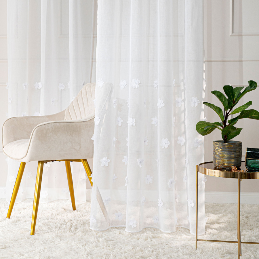 Wyjątkowa dekoracja okienna łącząca w sobie subtelność etaminy z bogatym zdobnictwem. Firanka charakteryzuje się misternym haftem z motywem kwiatowym, w którym zastosowano technikę 3D. Kluczowym elementem firany jest motyw kwiatowy, tworzący efekt trójwymiarowości (3D). Każdy detal kwiatowy został dodatkowo wzbogacony elegancką perłą, co nadaje wnętrzu luksusowy charakter.
