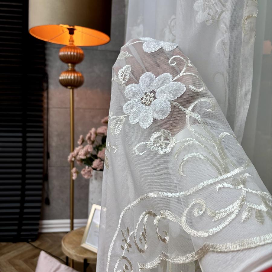 Elegancka kremowa firana na przelotkach z kwiatowym haftem