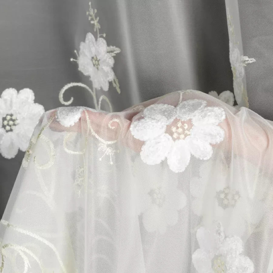to synonim subtelnej elegancji i romantycznego uroku, idealna do upiększenia każdego wnętrza – od sypialni po salon. Firana wykonana z delikatnej, transparentnej siateczki, pięknie rozprasza światło, wpuszczając do pomieszczenia jasność, a jednocześnie zapewniając dyskrecję. Jej największą ozdobą jest elegancki haft kwiatów, umieszczony na całości firany. Subtelne motywy kwiatowe nadają firanie wyrafinowany i romantyczny charakter. Doskonale pasuje do wnętrz urządzonych w stylu klasycznym, prowansalskim oraz wszędzie tam, gdzie liczy się lekkość i ciepła atmosfera.