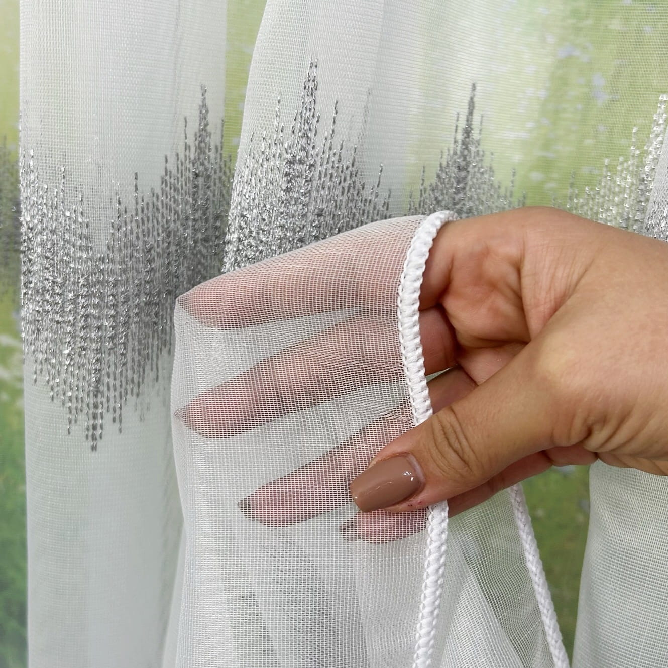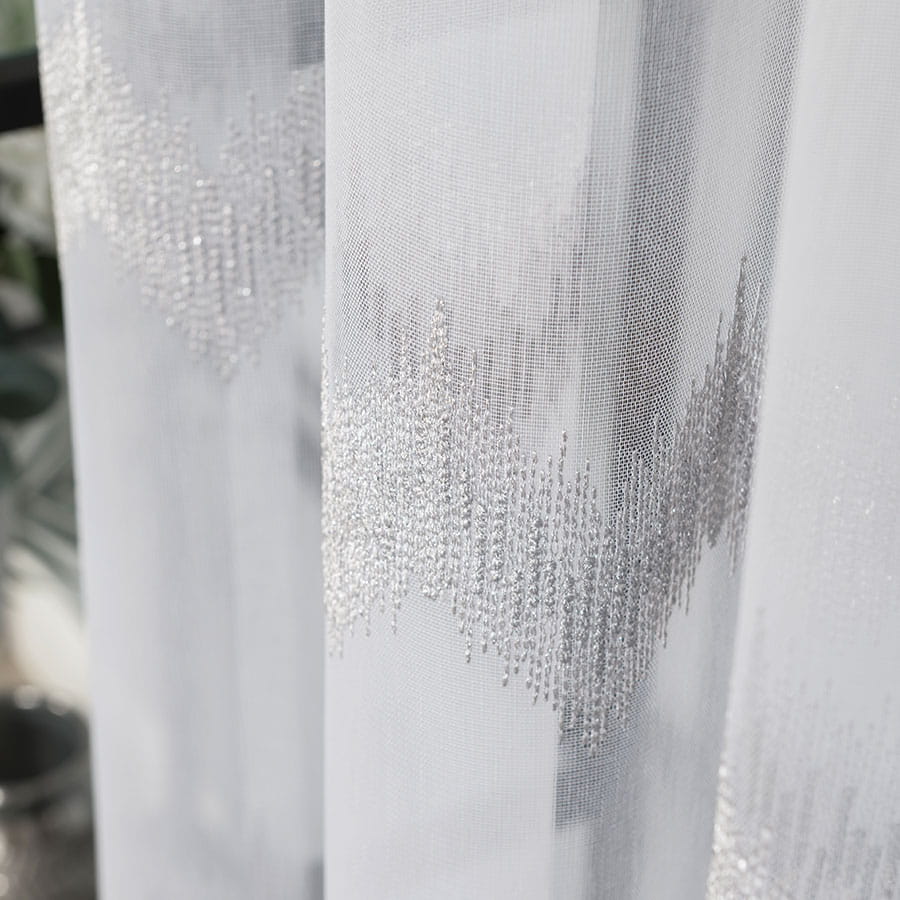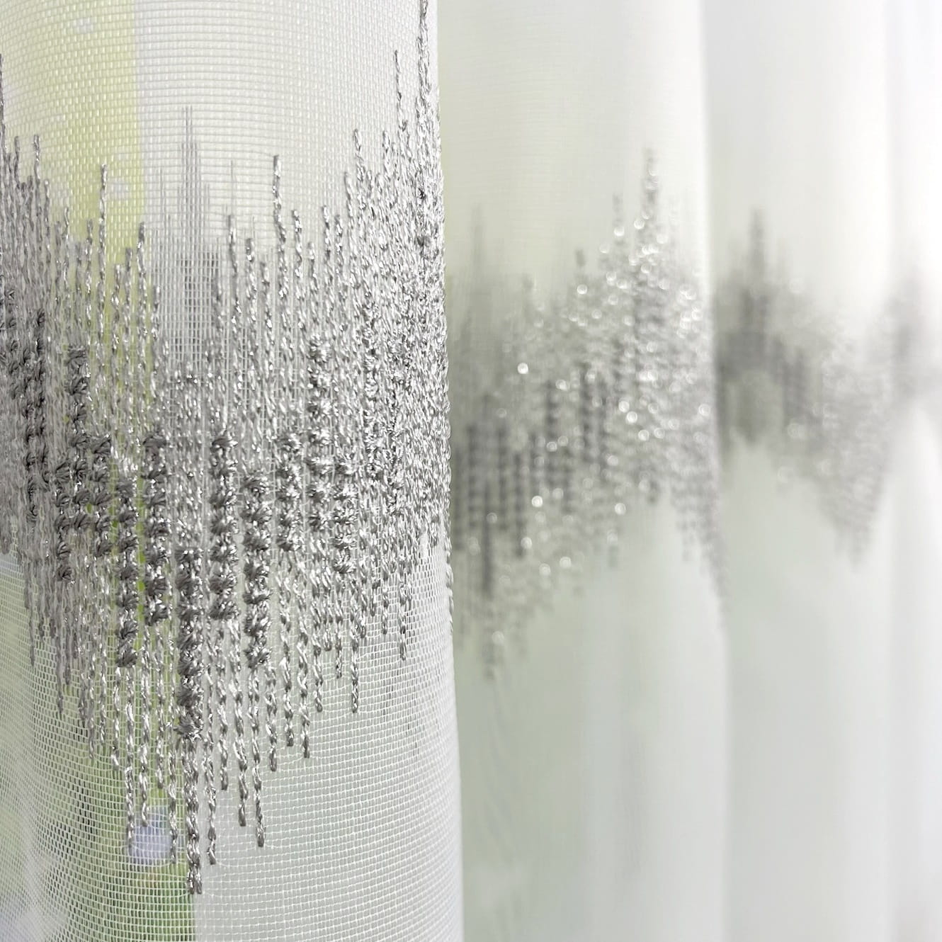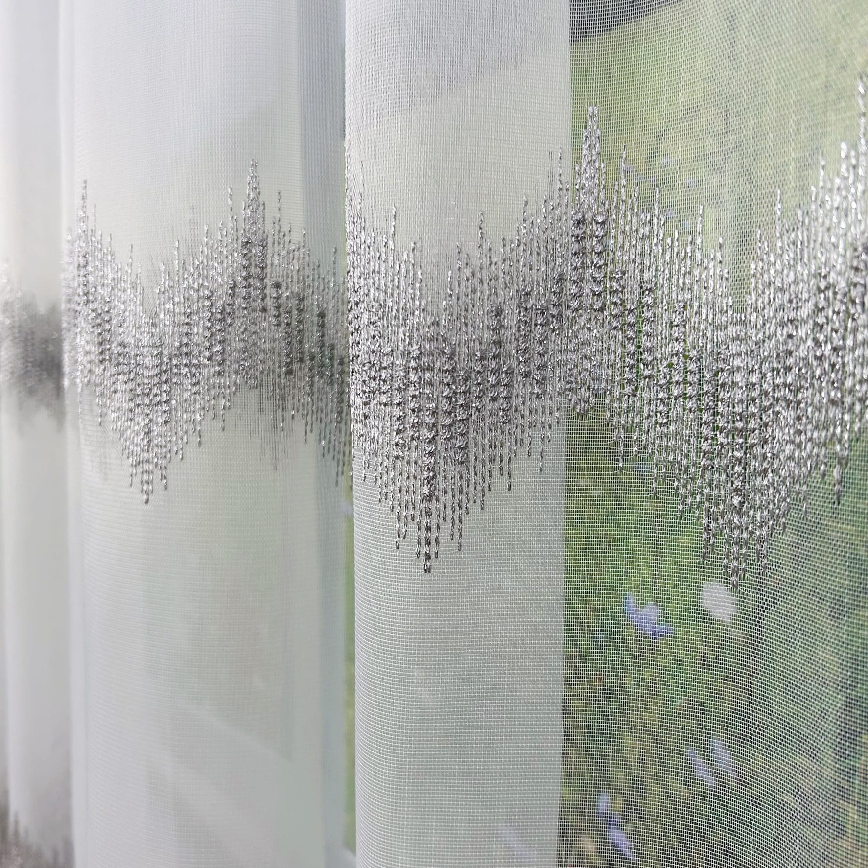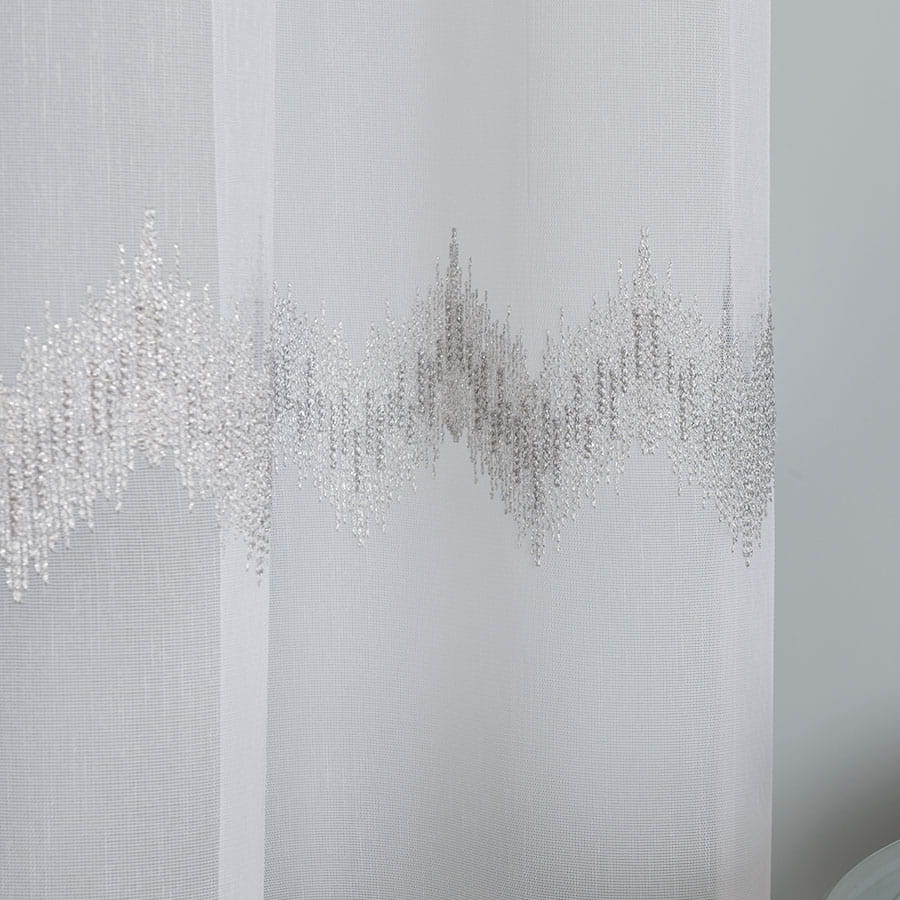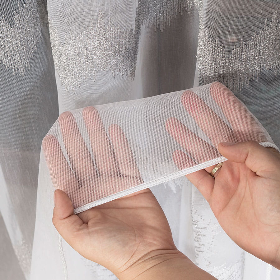 Nasz produkt wyróżnia się pięknym geometrycznym haftem, który dodaje elegancji i nowoczesności. Dodatkowo, srebrna nitka sprawia, że firana pięknie połyskuje i mieni się w świetle, tworząc wyjątkowy efekt w Twoim pomieszczeniu.