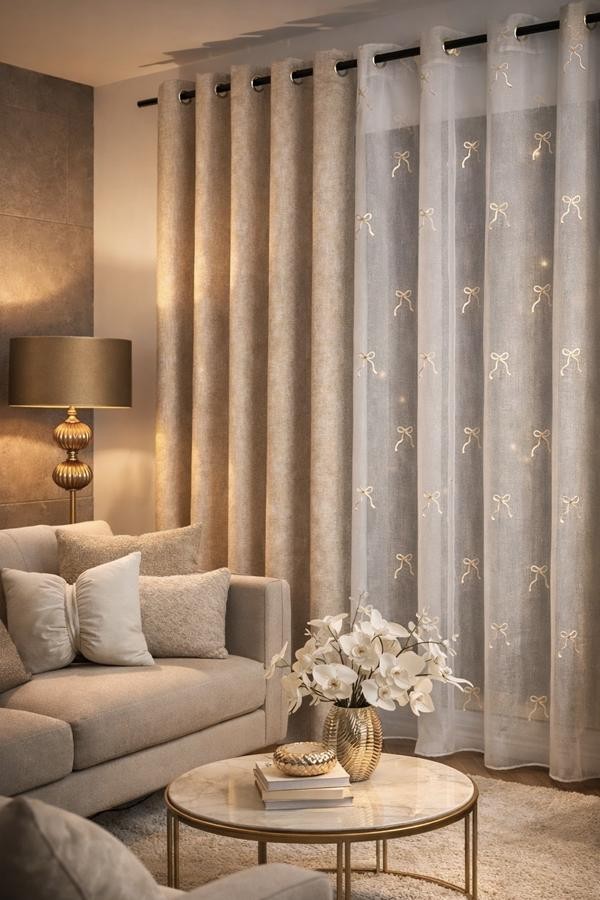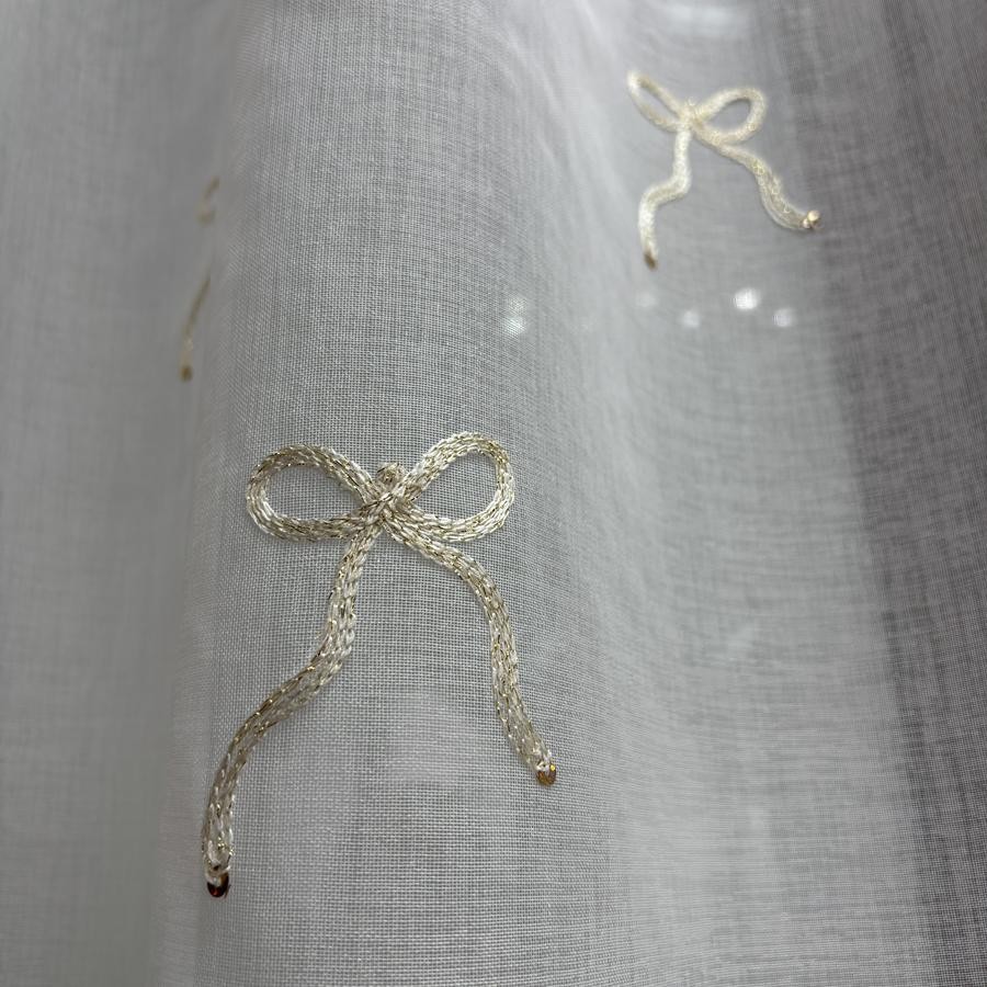 Firanka uszyta z lekkiej i półprzezroczystej etaminy, wykończona dołem ołowianym obciążnikiem charakteryzuje się trwałością i łatwością w pielęgnacji. Jej neutralny, biały kolor pasuje do różnych aranżacji wnętrz, dodając im lekkości. Główną ozdobą jest haftowany na całej powierzchni wzór w postaci złotych kokardek zakończonych cekinami. Motyw kokardek nadaje firance romantyczny, dziewczęcy lub klasyczny charakter, idealny do sypialni, salonu czy kuchni, wprowadzając do wnętrza urok i przytulność.