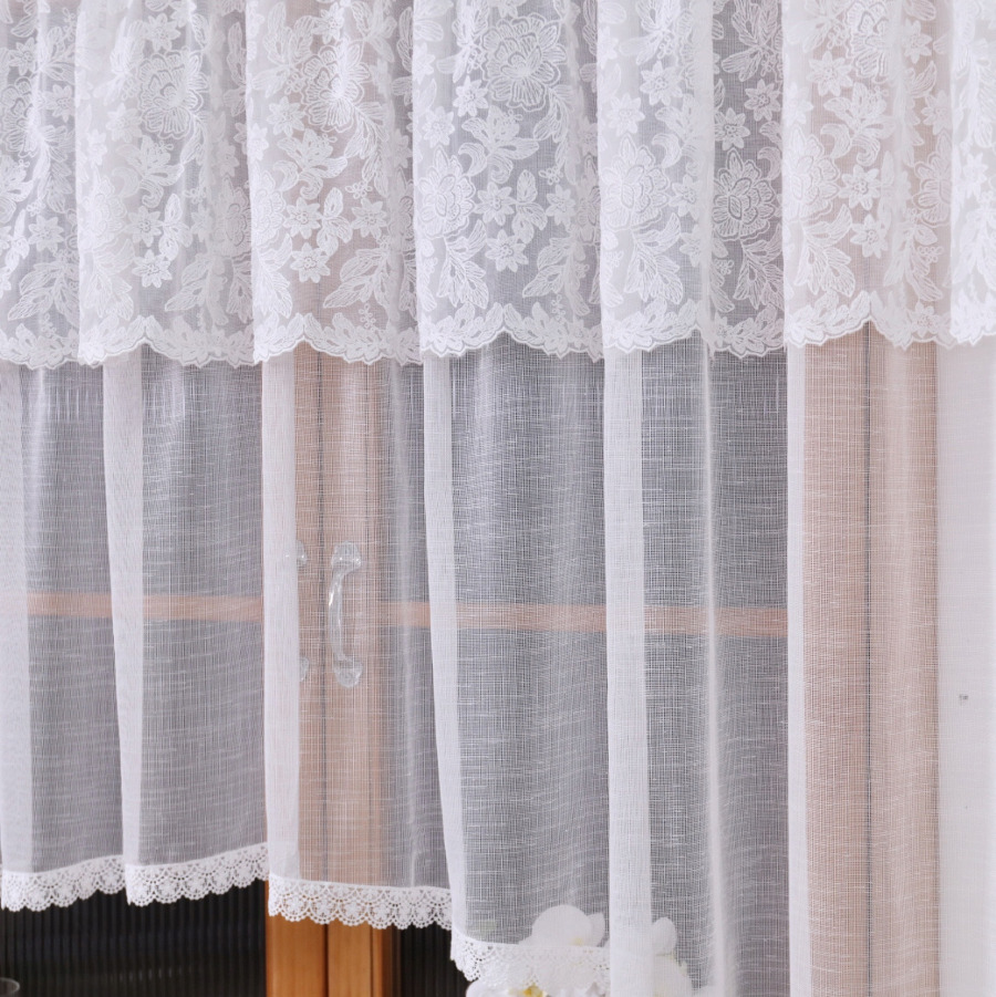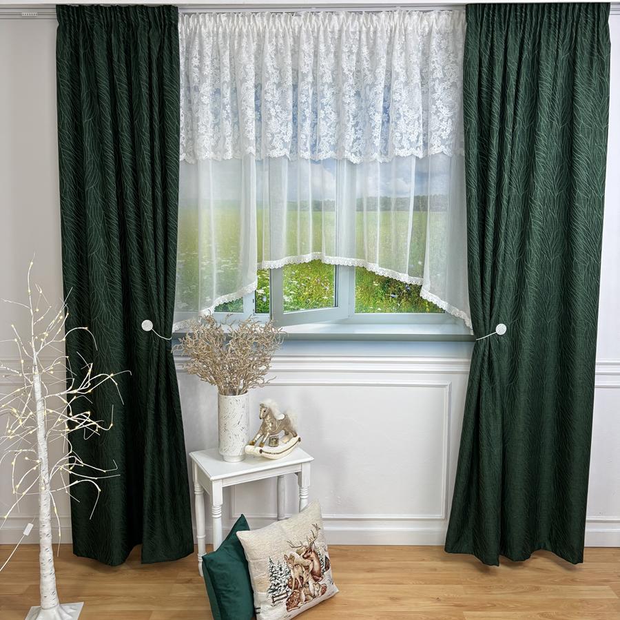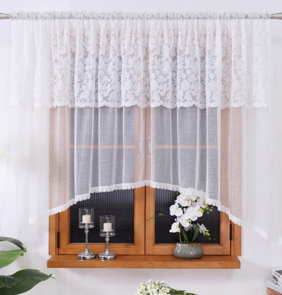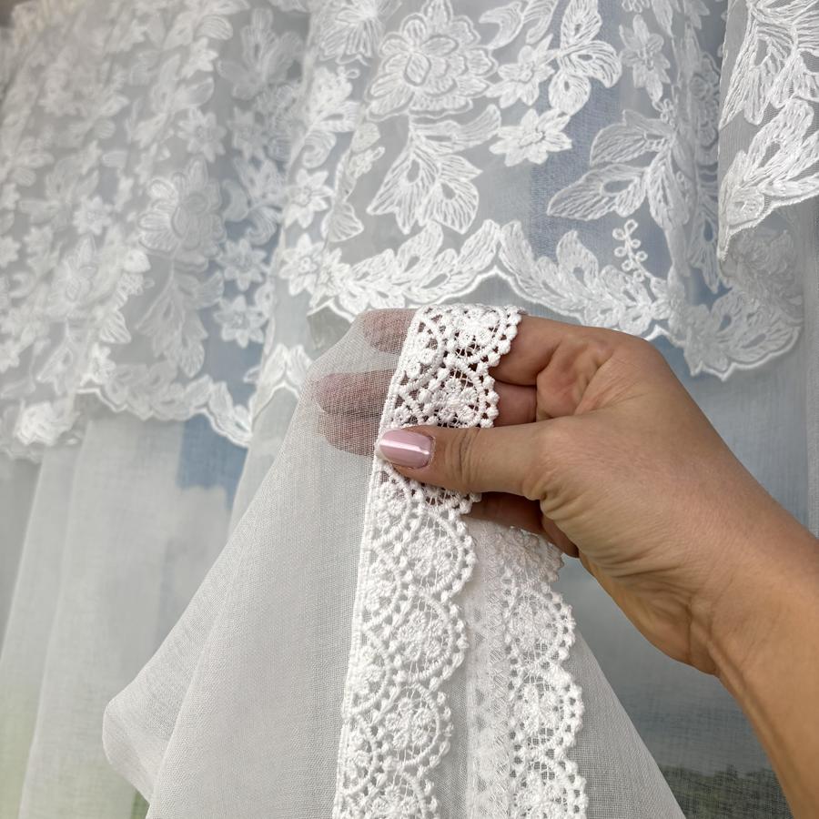 łączy w sobie klasyczną elegancję z subtelnym wzornictwem. Produkt został ozdobiony lambrekinem z precyzyjnym kwiatowym haftem, który nadaje wnętrzu lekkości i świeżości. Charakterystyczne wycięcie w łuku pozwala na wyeksponowanie parapetu lub elementów dekoracyjnych na nim stojących, a wykończenie gipiurą dodaje całości szlachetnego wyrazu.