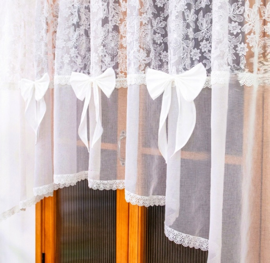łączy w sobie klasyczną elegancję z subtelnym wzornictwem. Produkt został ozdobiony precyzyjnym kwiatowym haftem, który nadaje wnętrzu lekkości i świeżości, oraz dużymi białymi kokardami. Charakterystyczne wycięcie w łuku pozwala na wyeksponowanie parapetu lub elementów dekoracyjnych na nim stojących, a wykończenie gipiurą dodaje całości szlachetnego wyrazu.