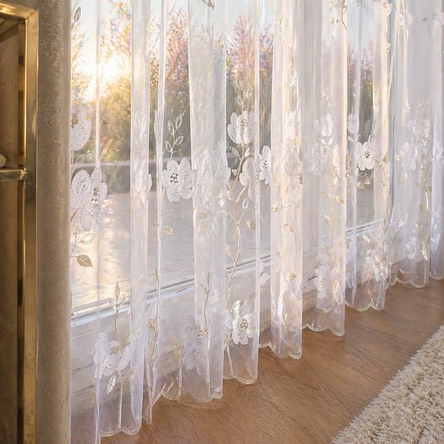 Elegancka gotowa firanka z biało-kremowym haftem kwiatowym