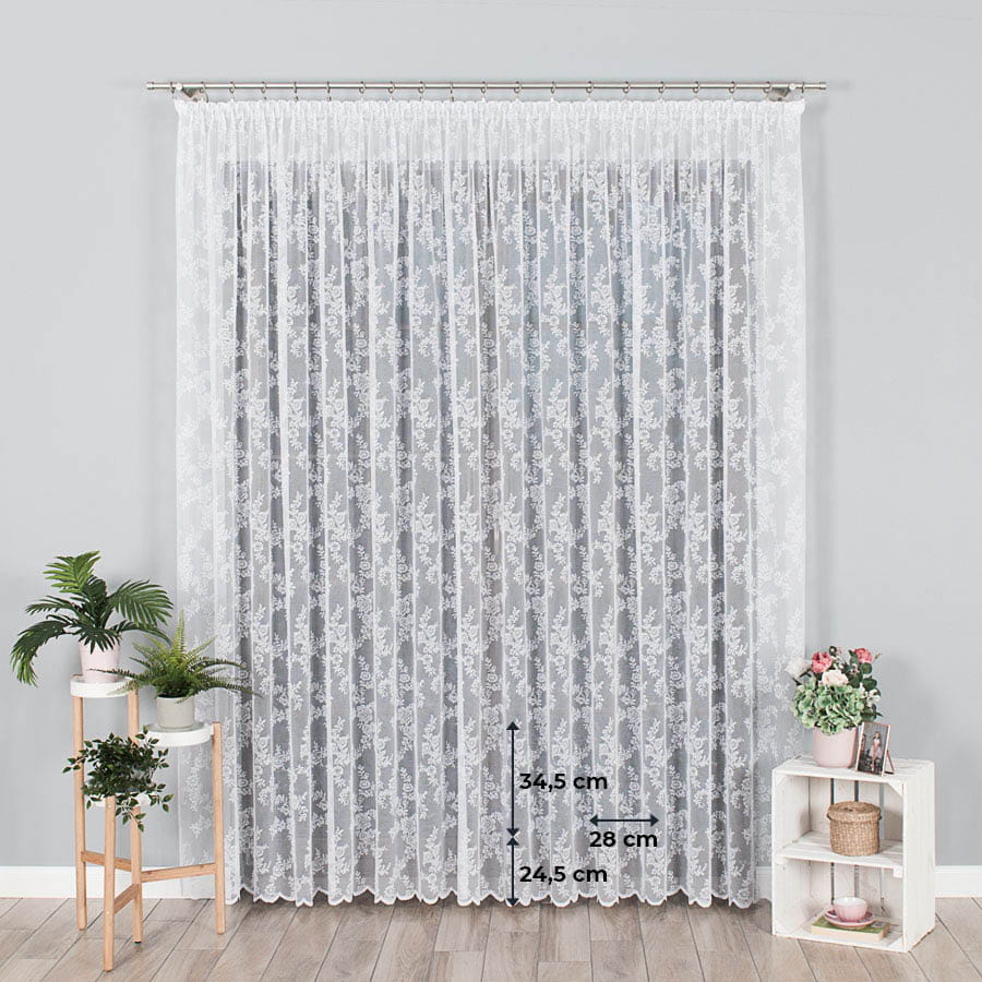 Firanka dostępna również w rozmiarach: szerokość (na prosto przed marszczeniem) x wysokość
