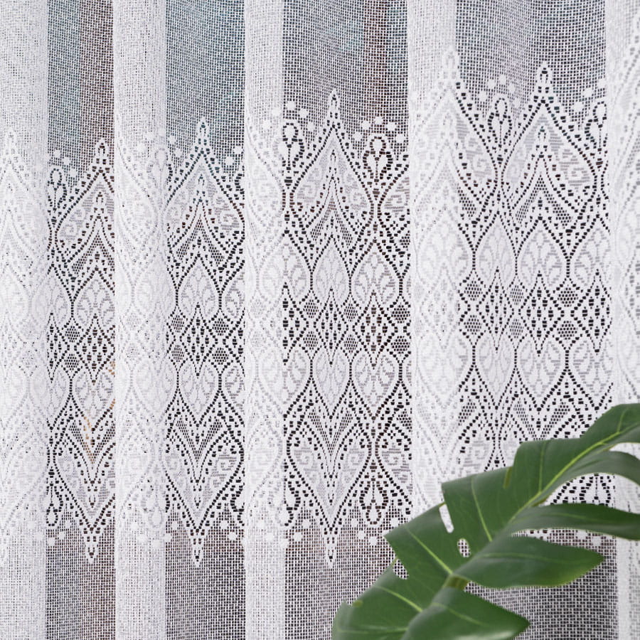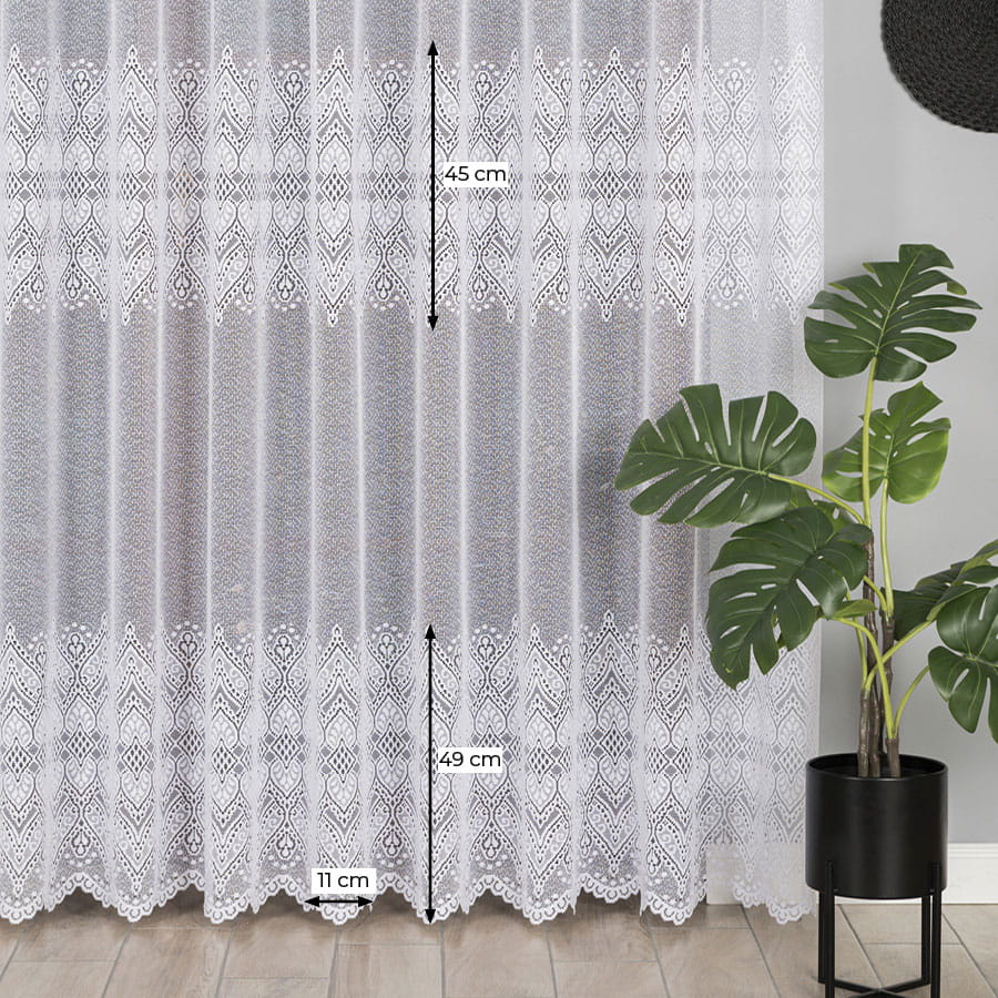 Biała firanka, ozdobiona dekoracyjnym fantazyjnym wzorem pasowym, wykonana jest z wysokiej jakości żakardu, który zapewnia trwałość i elegancję na długie lata. Jest niezwykle łatwa w pielęgnacji - nie wymaga prasowania, a dzięki wysokiej jakości materiałowi, z którego została wykonana, jest trwała i odporna na uszkodzenia. Oferując wiele możliwości aranżacyjnych i dekoracyjnych jest doskonałym dodatkiem do każdego wnętrza.