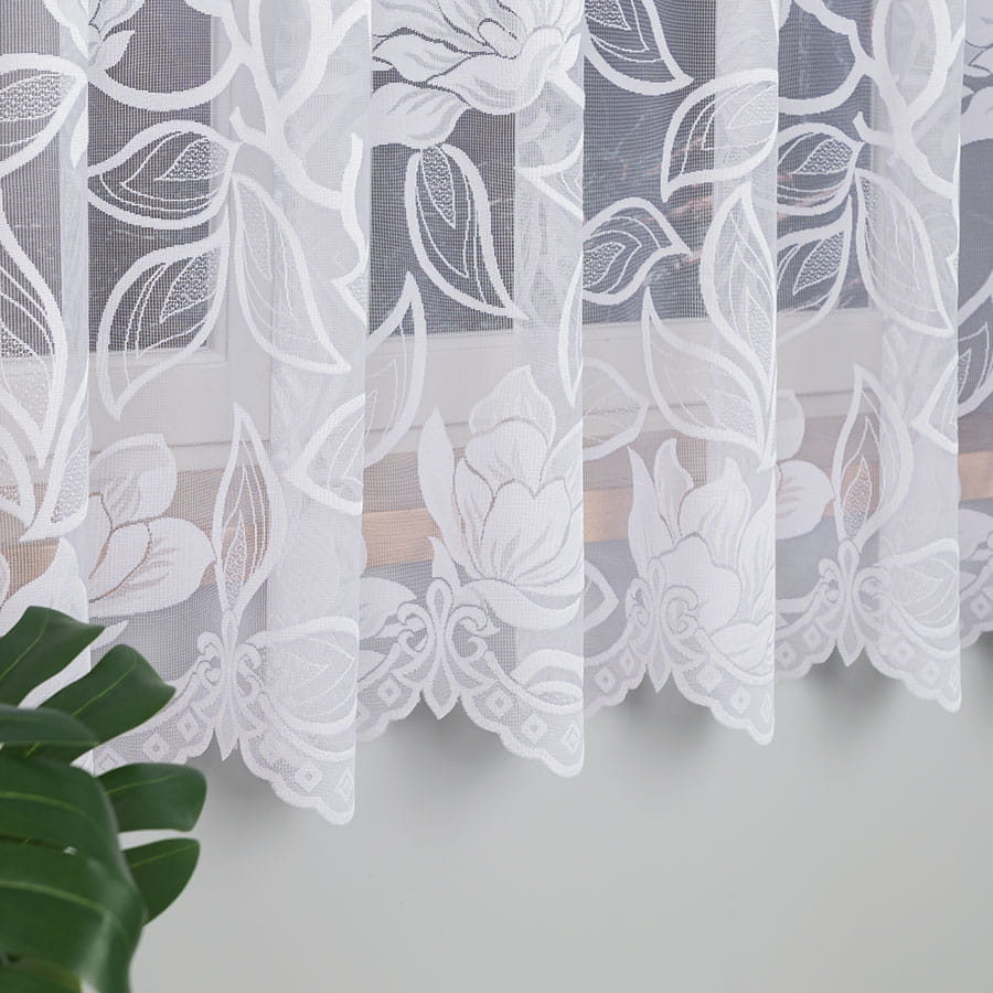 Biała firanka, wykończona dekoracyjnym, kwiatowym wzorem po całości. Doskonale wkomponuje się w większość wnętrz.