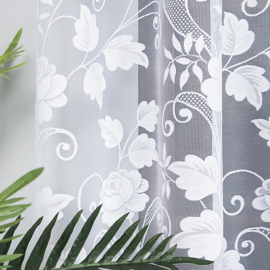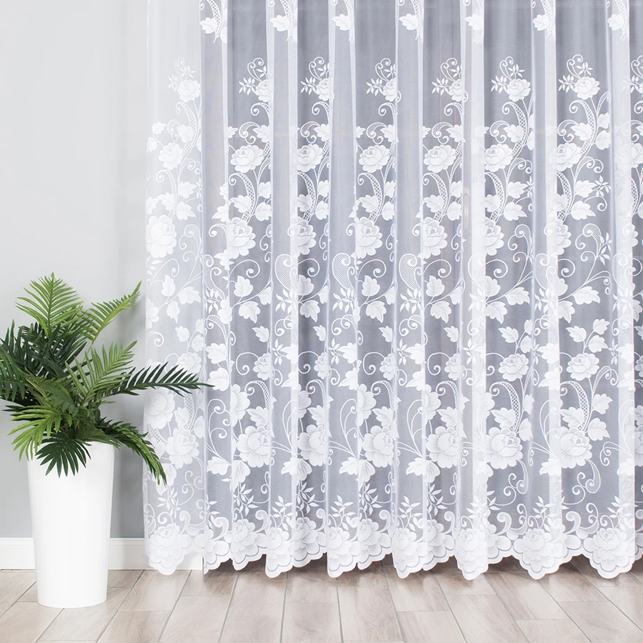 Biała firanka, ozdobiona dekoracyjnym wzorem kwiatowym, wykonana jest z wysokiej jakości żakardu, który zapewnia trwałość i elegancję na długie lata. Jest niezwykle łatwa w pielęgnacji - nie wymaga prasowania, a dzięki wysokiej jakości materiałowi, z którego została wykonana, jest trwała i odporna na uszkodzenia. Oferując wiele możliwości aranżacyjnych i dekoracyjnych jest doskonałym dodatkiem do każdego wnętrza.
