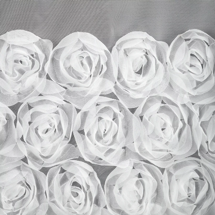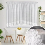 wykonana z lekkiej i transparentnej siateczki, doskonale rozprasza światło, tworząc przyjemną, jasną atmosferę, jednocześnie zapewniając subtelną prywatność. Jej charakterystyczny krój w łuk nadaje firanie lekkości i zwiewności, idealnie eksponując okno i jednocześnie zapewniając dyskrecję. Główną dekoracją jest ozdobny pas różyczek, starannie umieszczony wzdłuż łuku firany. Subtelne, trójwymiarowe róże dodają firanie wyjątkowej lekkości i uroku. Firana utrzymana w romantycznym stylu świetnie pasuje do sypialni, salonu czy jadalni, wprowadzając nastrojową atmosferę.