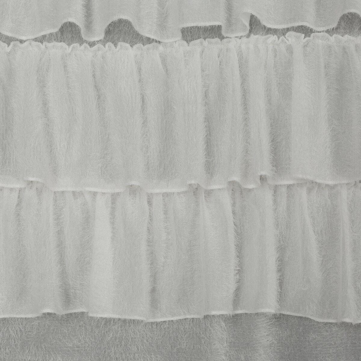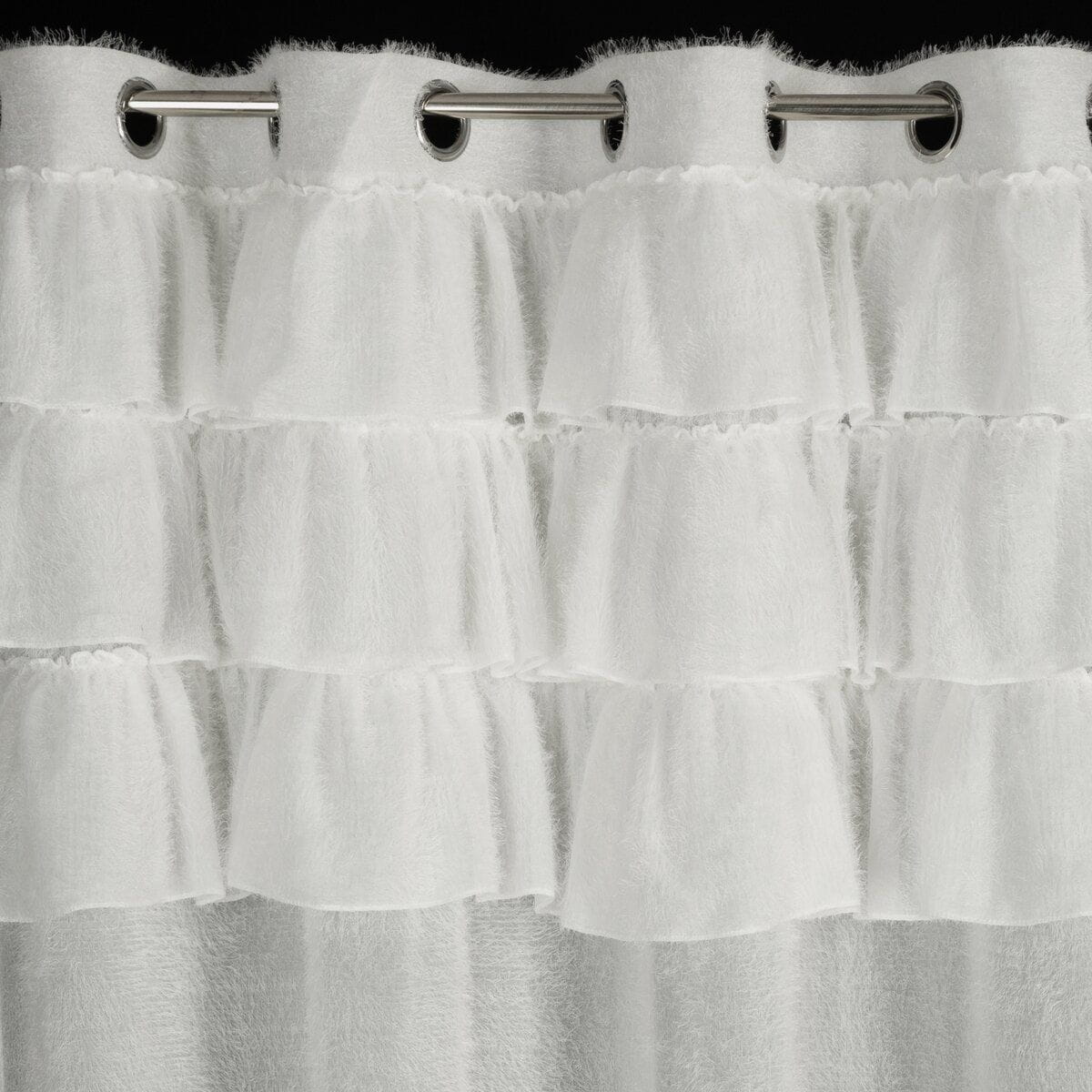 Zasłona gotowa z tkaniny moherowej w kolorze białym, dodaje wnętrzu oryginalności, dzięki falbanom w górnej części zasłony. Zasłona stanowi idealne dopełnienie aranżacji wnętrza, a mocowanie na praktycznych przelotkach sprawia, że jej zawieszenie i równe ułożenie na karniszu nie zabiera wiele czasu.