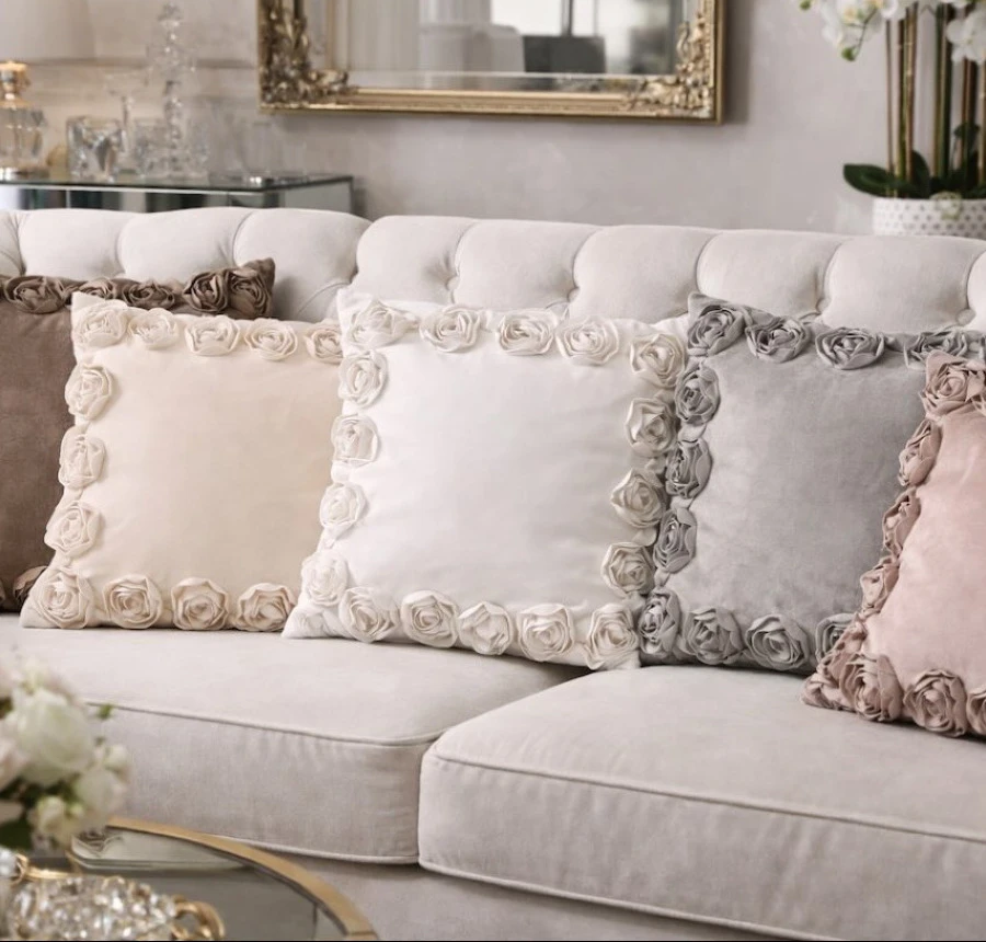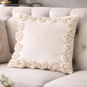 Poszewka welwetowa beżowa z brzegami obszytymi pasem róż 45x45 cm AR35