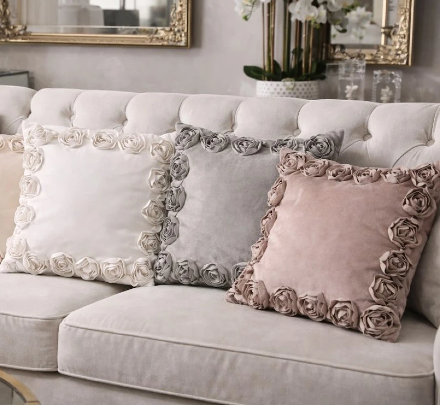 Wykonana z miękkiego, przyjemnego w dotyku welwetu, zachwyca nie tylko głębią koloru, ale przede wszystkim unikalnym wykończeniem. Brzegi poszewki zostały obszyte efektownymi, trójwymiarowymi kwiatami róż, które nadają jej luksusowy i romantyczny charakter. To idealny dodatek do salonu lub sypialni, który przyciąga wzrok i dodaje aranżacji wyjątkowej tekstury. Dzięki starannemu wykonaniu i dbałości o detale, poszewka prezentuje się niezwykle elegancko na każdej kanapie czy fotelu.