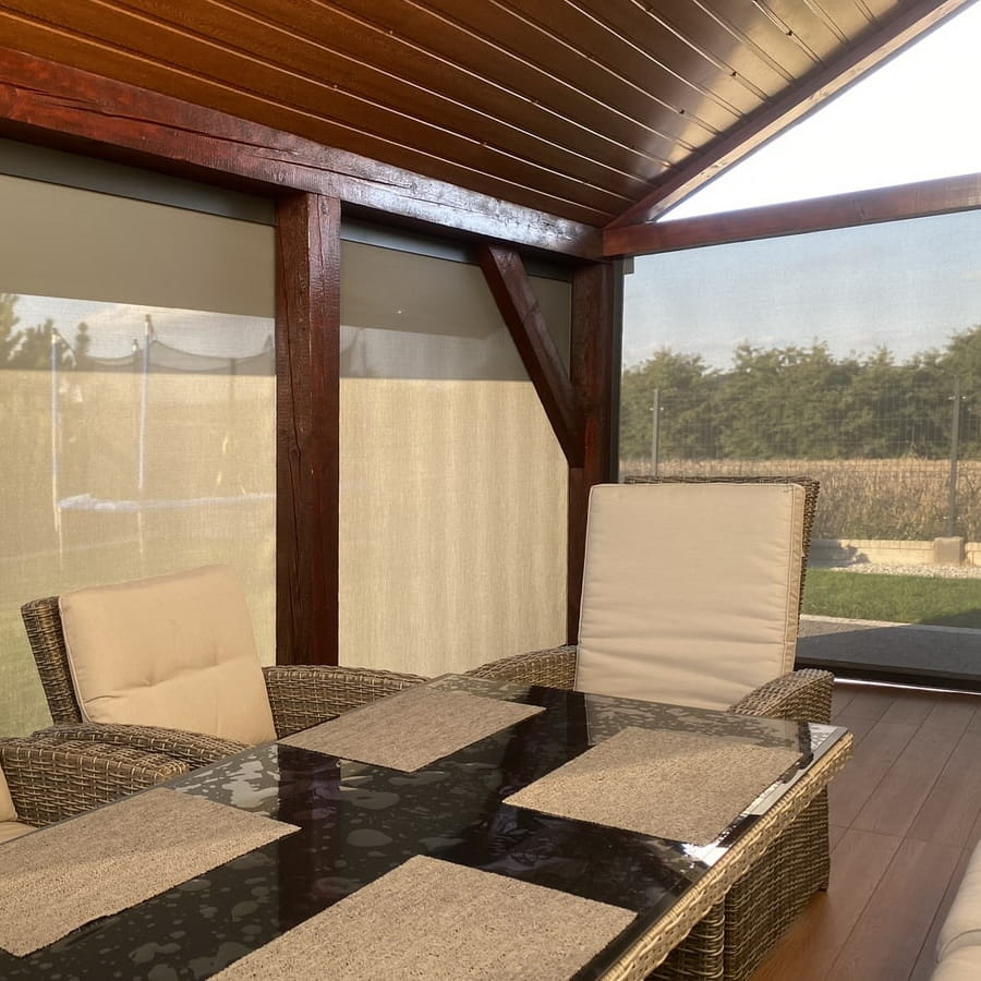 - Tkanina: mieszanka włókien szklanych i PCV. Specjalistyczna tkanina screen zip, zapewniająca doskonałą ochronę przed słońcem, wiatrem i wzrokiem sąsiadów.