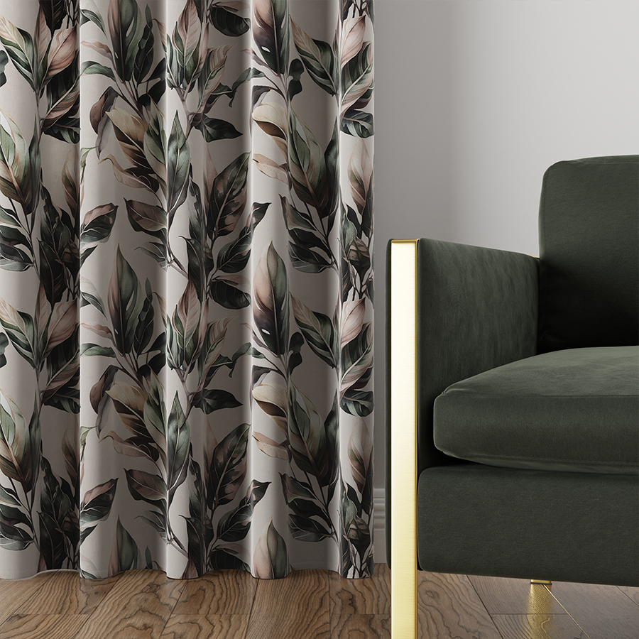Delikatna i przyjemna w dotyku tkanina z motywem liści, charakteryzuje się niezwykłą miękkością, aksamitną w dotyku powierzchnią oraz delikatnym połyskiem. Tkanina ta to popularny wybór do dekoracji wnętrz, dodający im elegancji i przytulności. Jest idealna dla osób, które pragną wprowadzić do swoich wnętrz element luksusu, komfortu i ponadczasowej elegancji.