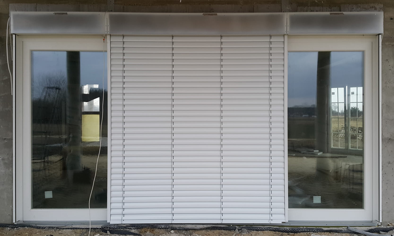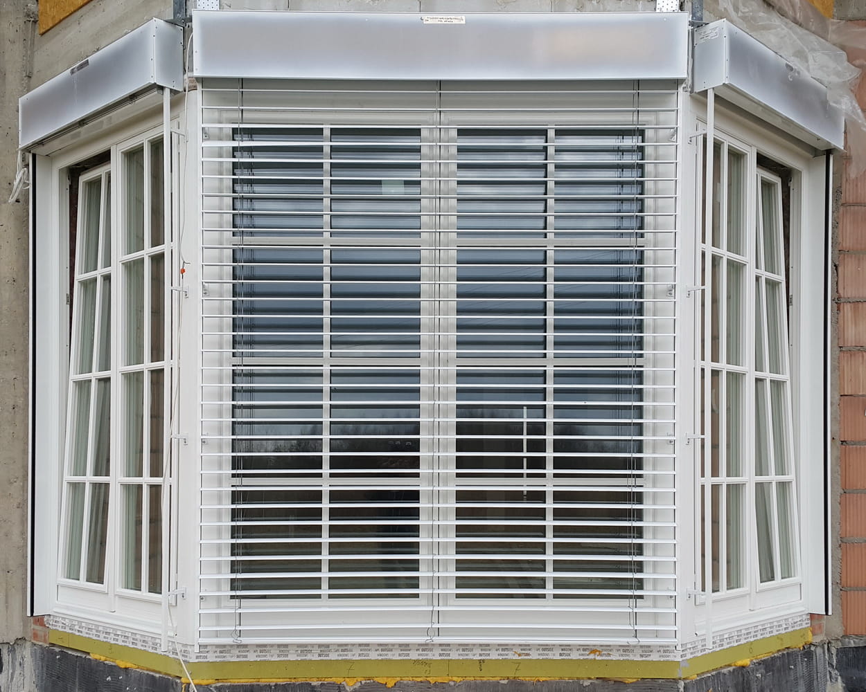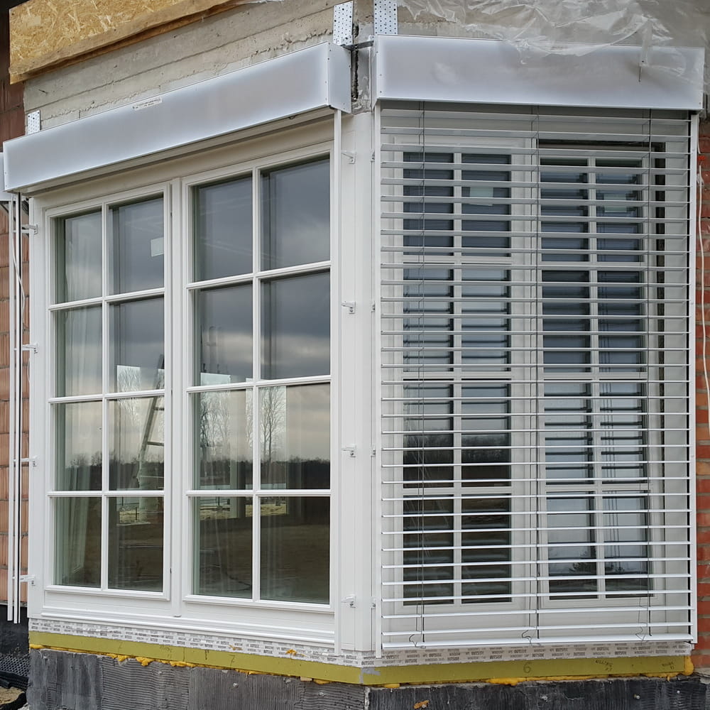 Widoczne są wyłącznie estetyczne lamele, które mogą zostać zwinięte do kasety umiejscowionej nad oknem pod elewacją.