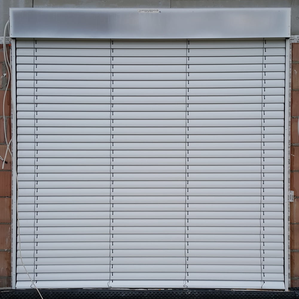 Żaluzja fasadowa zewnętrzna w systemie SOLIDBOX. Kolor biały w rozmiarze 220x270 cm.