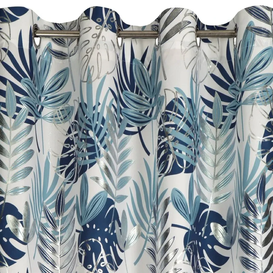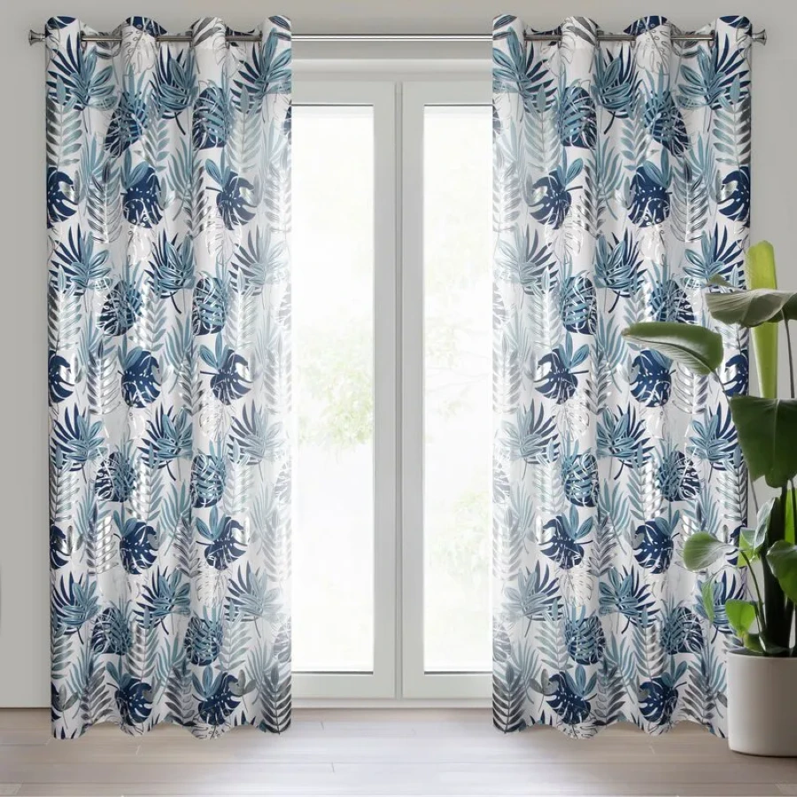 Zasłonę z lekkiej, tkaniny zdobi nadruk w granatowo-srebrne liście na kontrastującym białym tle. Tkanina osłania wnętrze przed światłem słonecznym, delikatnie je filtrując i nie zaciemniając jednocześnie wnętrza. To prosty i efektowny sposób na dodanie świeżości i naturalnego akcentu do każdego wnętrza. Tego typu zasłony są niezwykle popularne, ponieważ motywy roślinne wprowadzają do pomieszczenia harmonię i spokój, jednocześnie będąc uniwersalnym elementem dekoracyjnym.