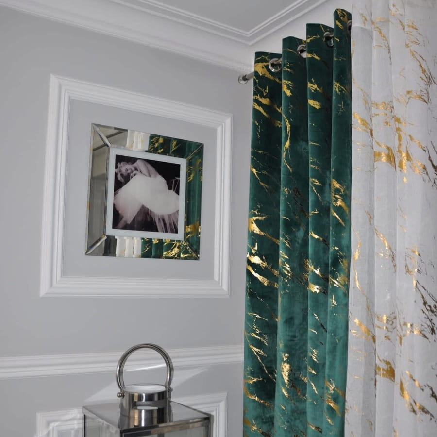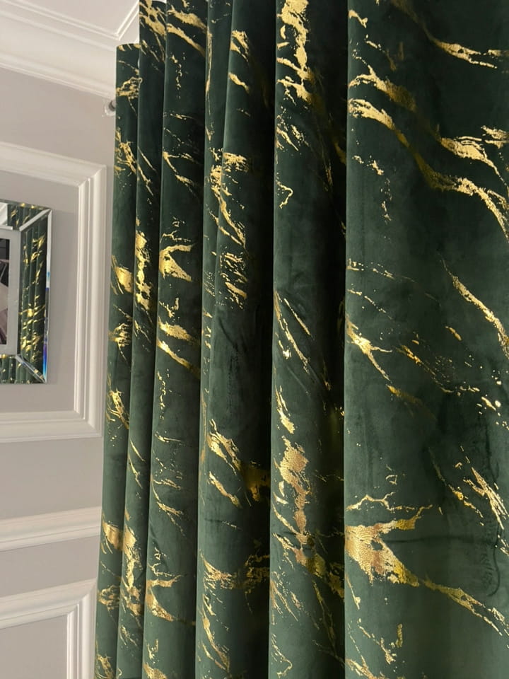 Zasłona welwetowa w kolorze zielonym ze złotym printem, rozmiar 140x270 cm.