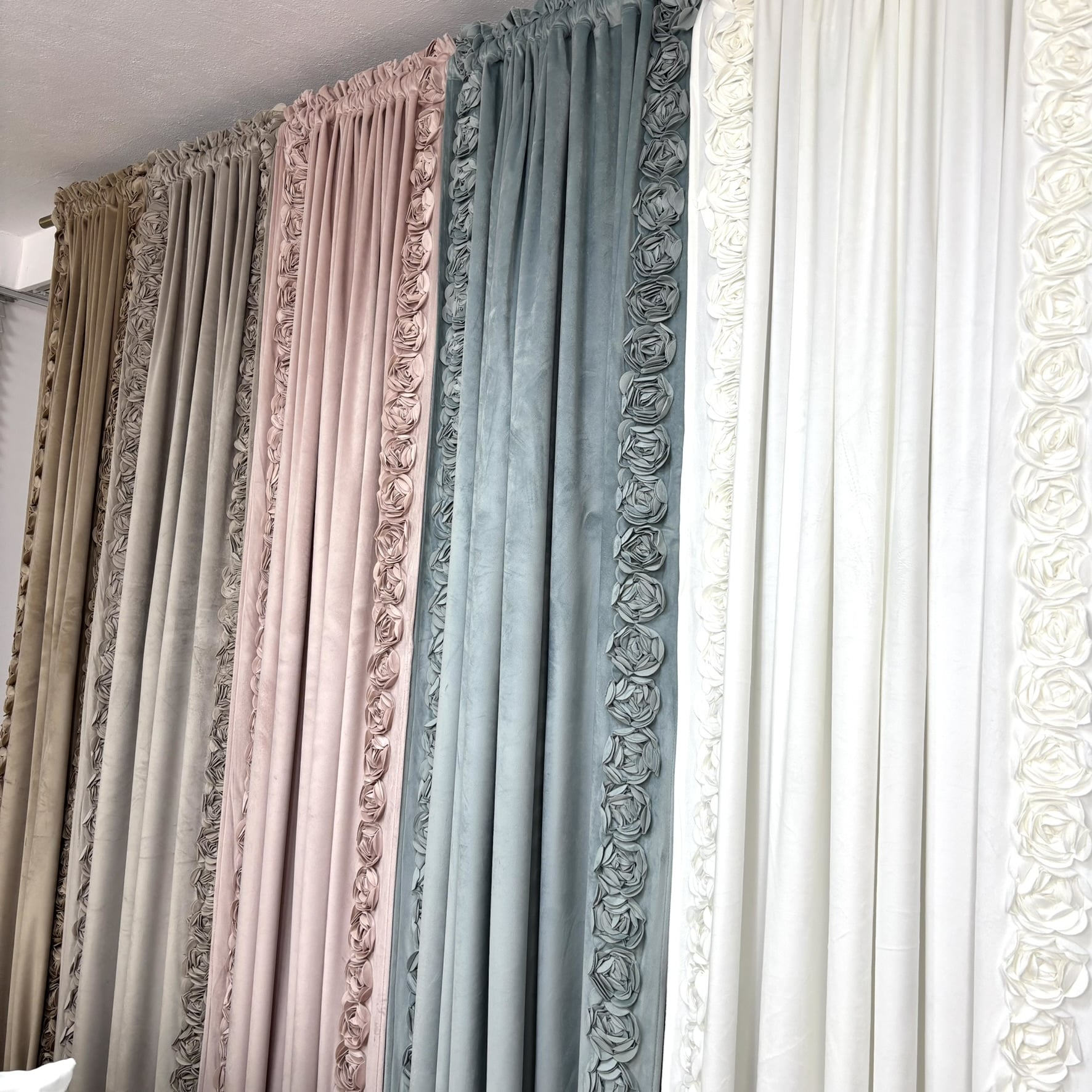 z wysokogatunkowej tkaniny welwetowej, wykończona na brzegach dekoracyjnym wzorem pasowym, to elegancka dekoracja okna, która łączy w sobie styl i funkcjonalność. Jej wyjątkowość podkreśla zdobienie brzegów pasem aplikacji kwiatów róż, który dodaje romantycznego i eleganckiego charakteru. Zasłona zachwyca aksamitnym dotykiem i głębokim, nasyconym kolorem, dodając wnętrzu przytulności i szlachetnego wyglądu.