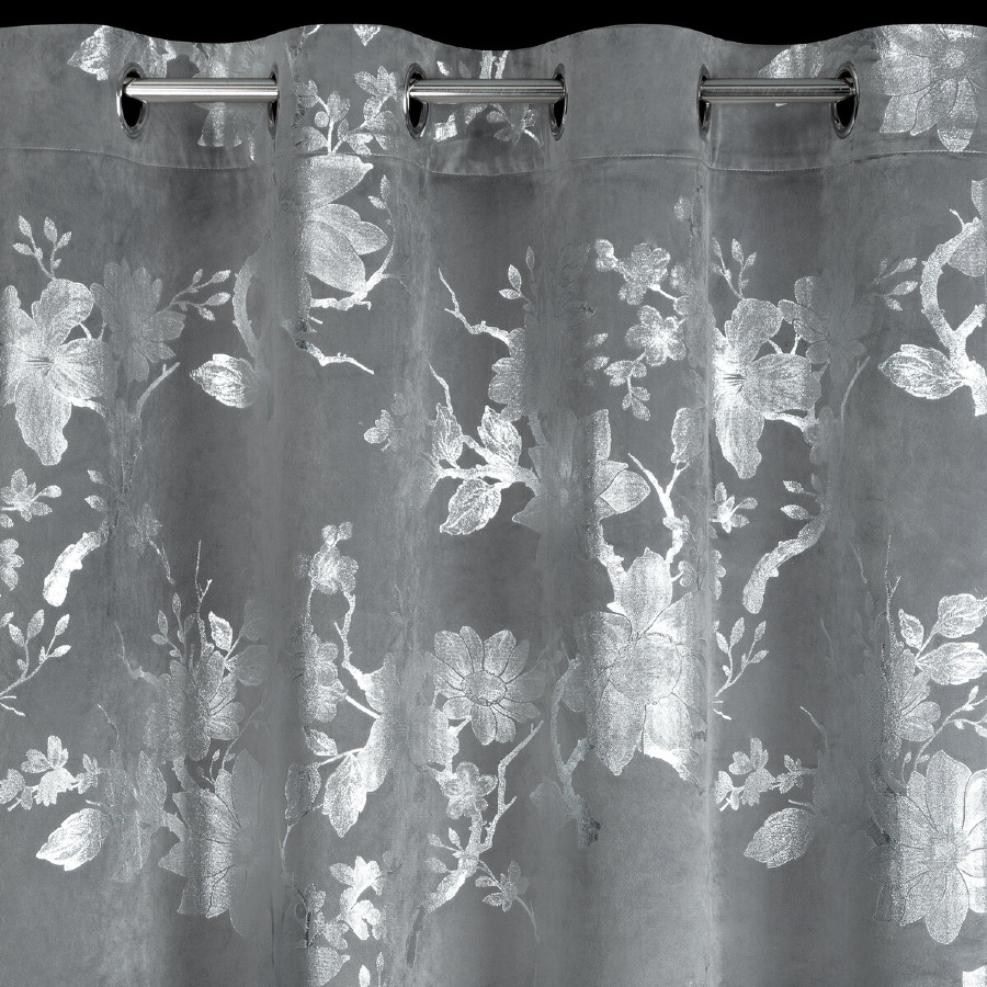 z wysokogatunkowej tkaniny welwet, ozdobiona dekoracyjnym kwiatowym nadrukiem w srebrnym kolorze. Zasłona stanowi idealne dopełnienie aranżacji wnętrza, któremu doda romantycznego wyglądu, a mocowanie na praktycznych przelotkach sprawia, że jej zawieszenie i równe ułożenie na karniszu nie zabiera wiele czasu.